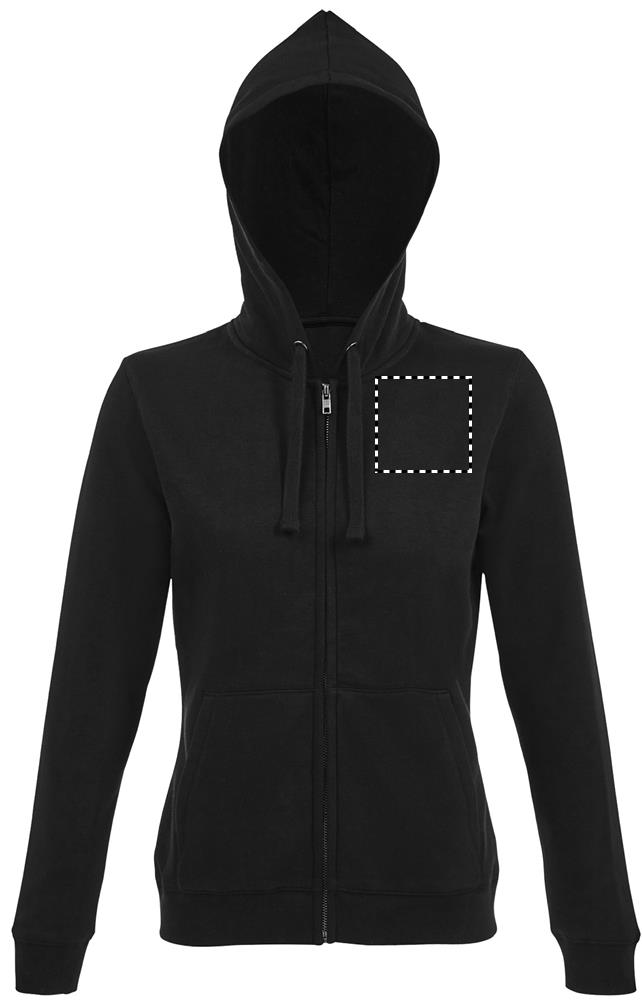 Felpa da donna, con cappuccio e zip da uomo, 80% cotone filato ad anelli - 20% poliestere Fodera spazzolata, Esterno: 100% cotone FLEECE 280 LSF (Low Shrinkage Fabric), Maniche a giro, 2 tasche anteriori a marsupio, Taglio e cucito, Cappuccio foderato con cordoncino tono su tono, Polsini e orlo a coste 2x2. Interno collo a mezzaluna, collo nastrato, cerniera YKK. OEKO-TEX®. Venduto solo con la stampa.