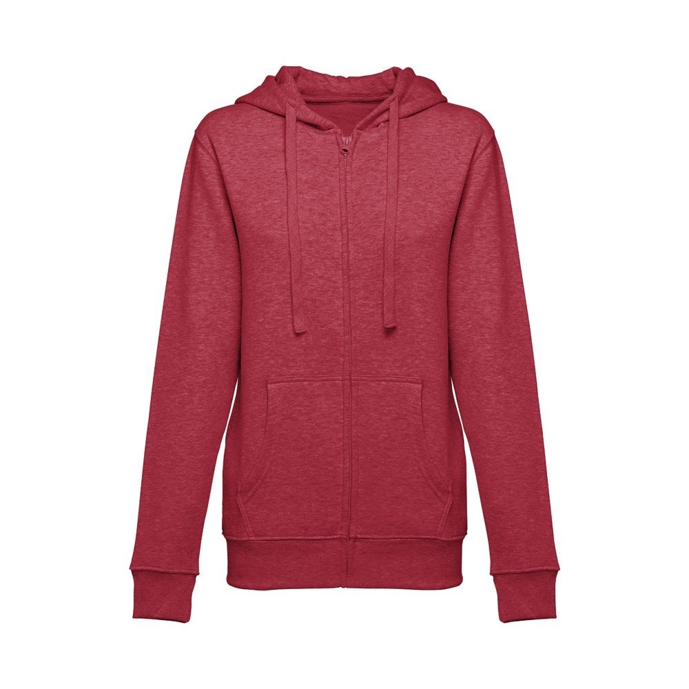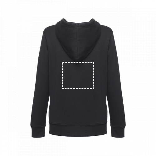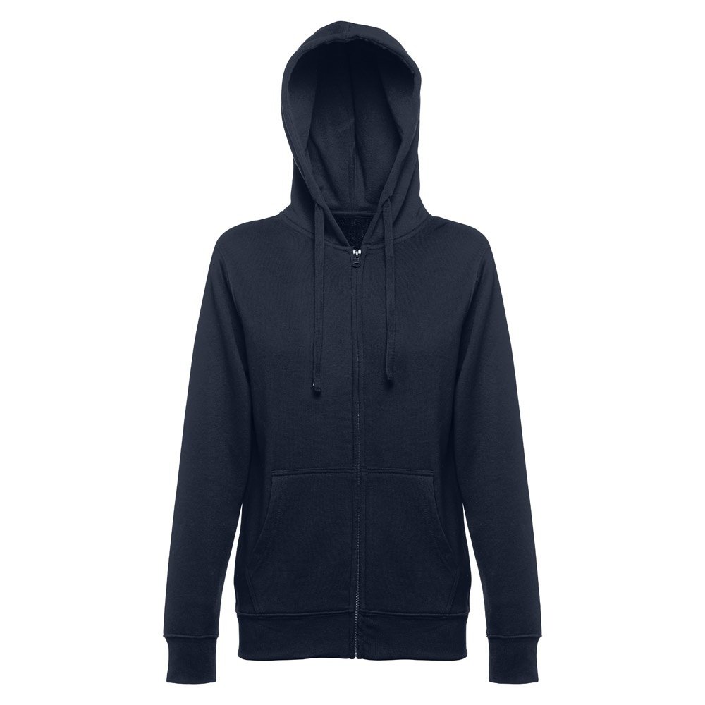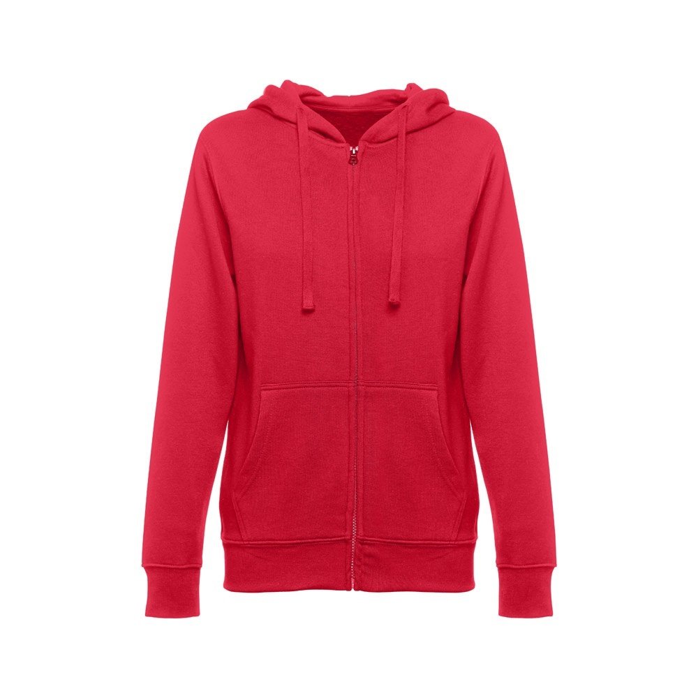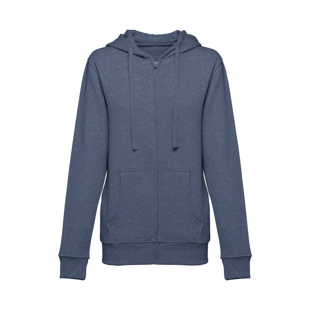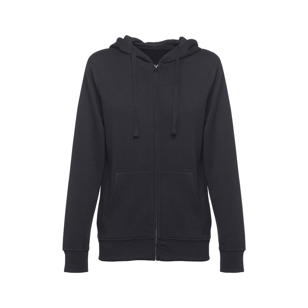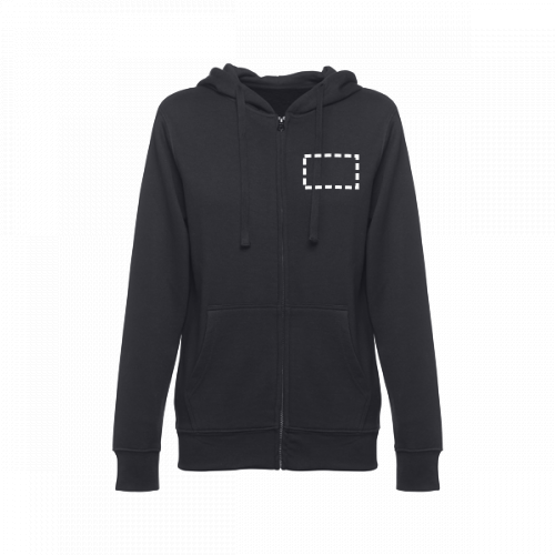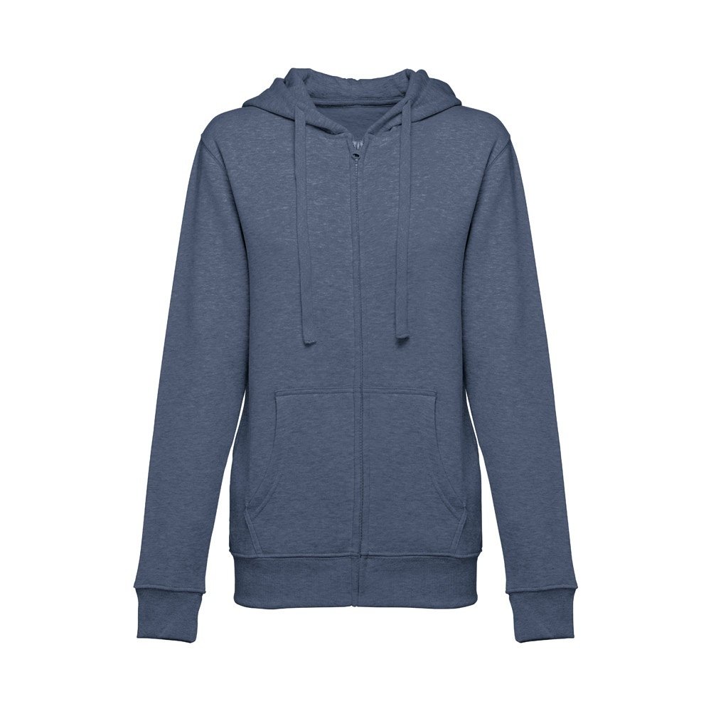 Felpa da donna, con zip e cappuccio in 50% cotone e 50% poliestere (320 g/m²) con interno spazzolato. Cappuccio con coulisse e con cordoncino in tinta. Presenta 2 tasche a marsupio con cerniera. Polsini e vita a costine
