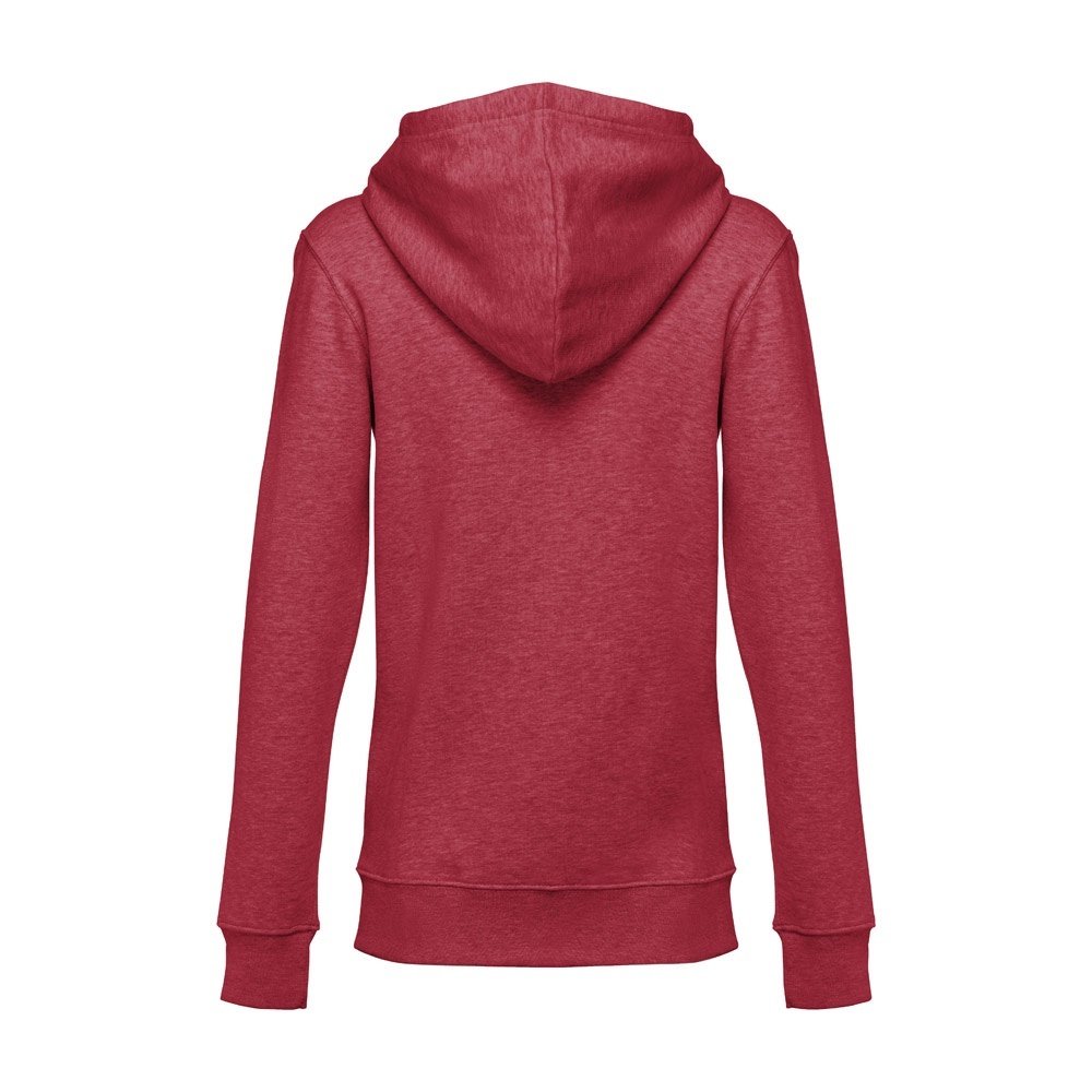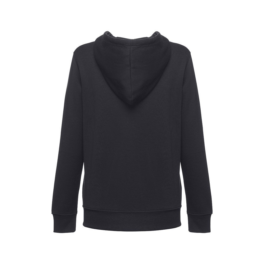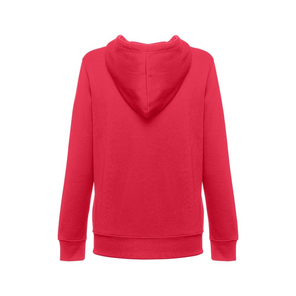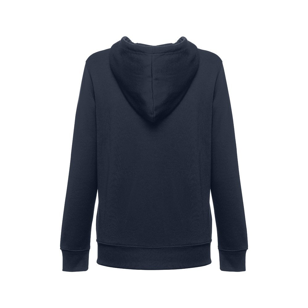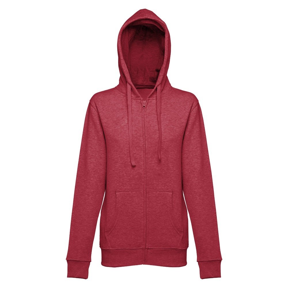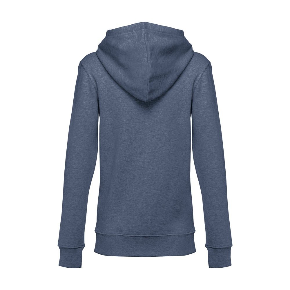 Felpa da donna, con zip e cappuccio in 50% cotone e 50% poliestere (320 g/m²) con interno spazzolato. Cappuccio con coulisse e con cordoncino in tinta. Presenta 2 tasche a marsupio con cerniera. Polsini e vita a costine