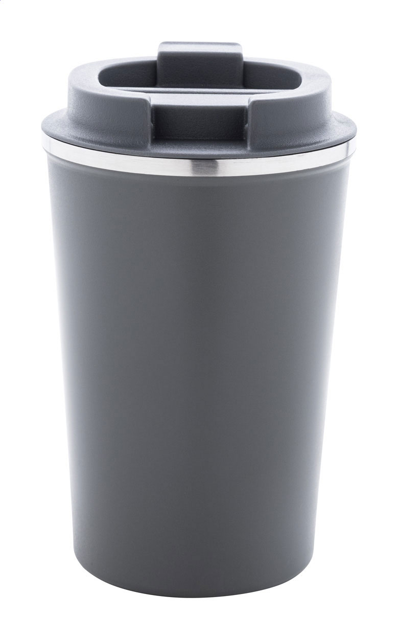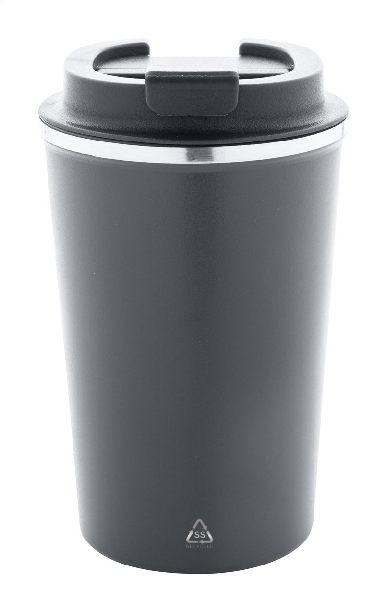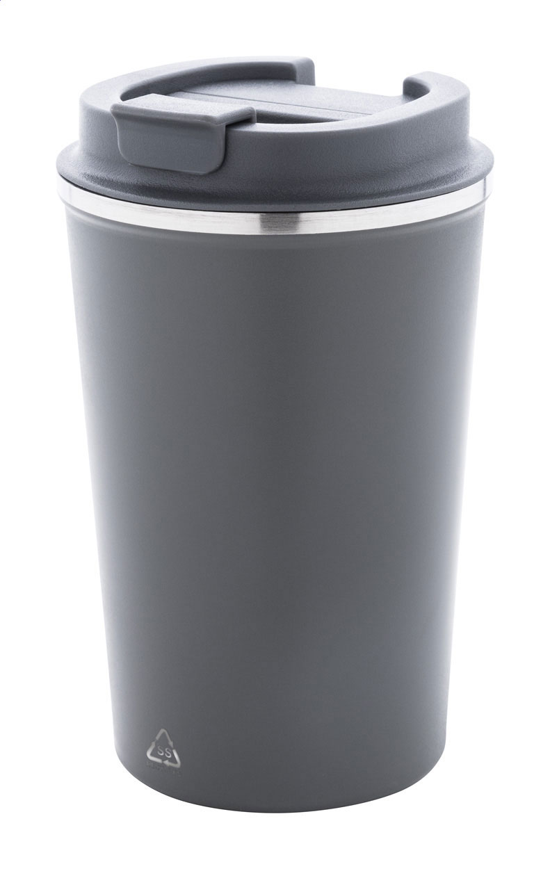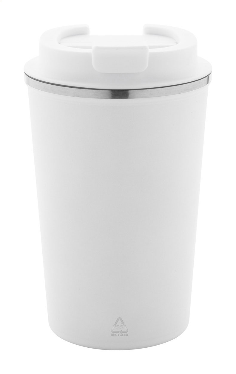 Bicchiere termico a doppia parete in acciaio riciclato con capacità di 350ml. e coperchio erogatore in PP.