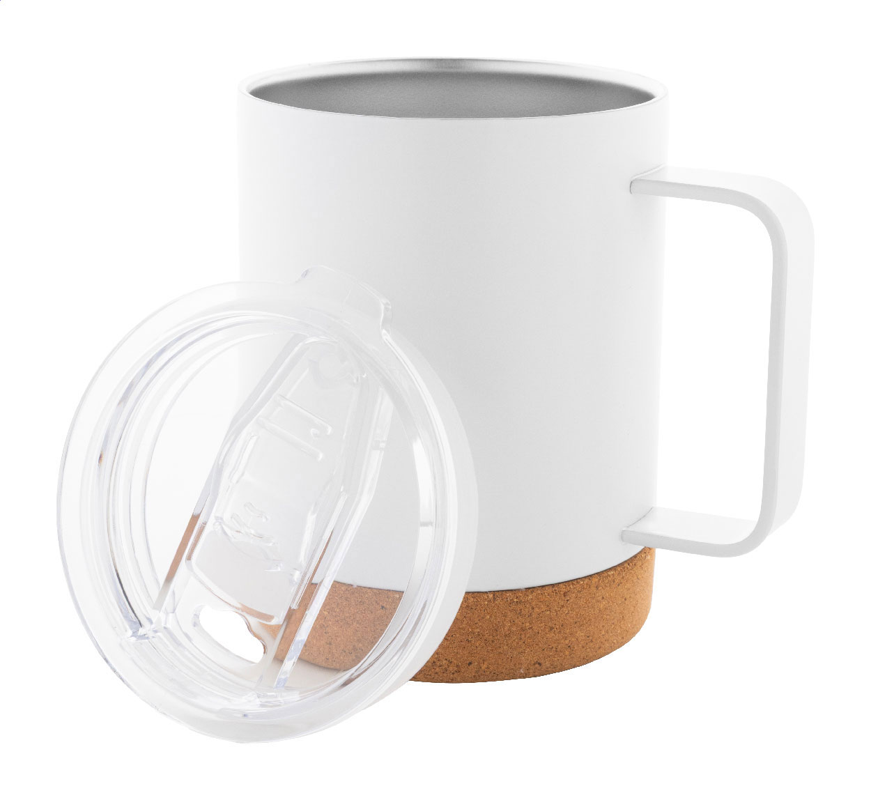Tazza termica da 330ml. in acciaio a doppia parete, con base e tappo in sughero naturale e confezione di cartoncino kraft.