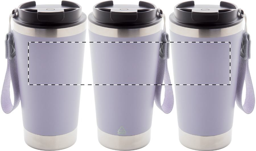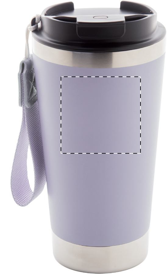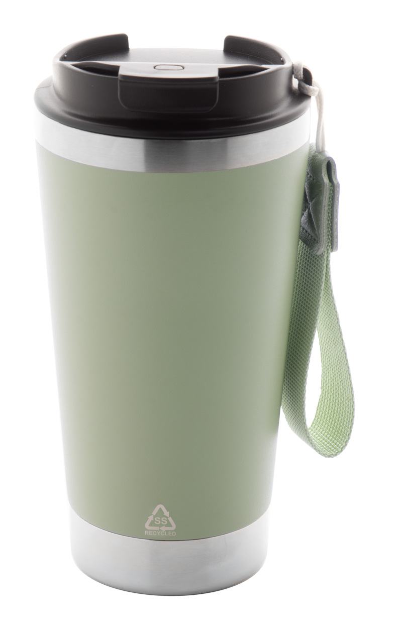 Tazza isotermica da 430ml. a doppia parete in acciaio inox riciclato, con coperchio in PP e laccetto in colore coordinato.