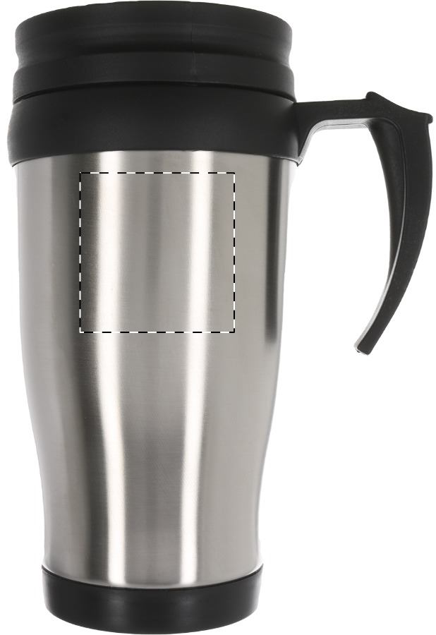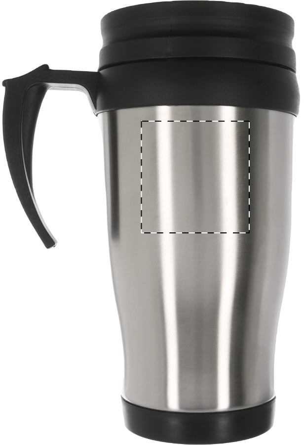 Tazza termica 450 ml. a doppia parete in metallo con manico in plastica e coperchio. Fornito in scatola di carta bianca.