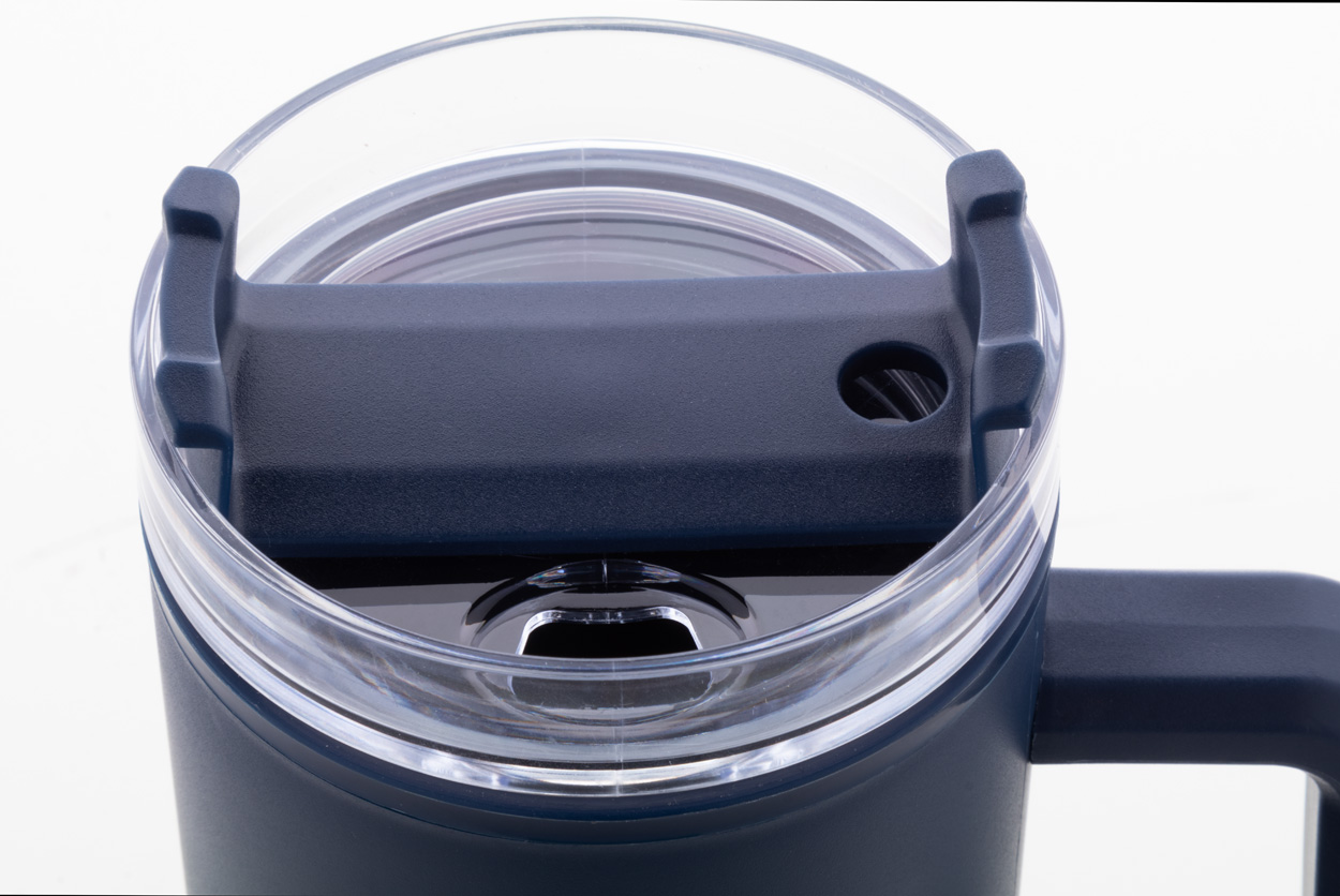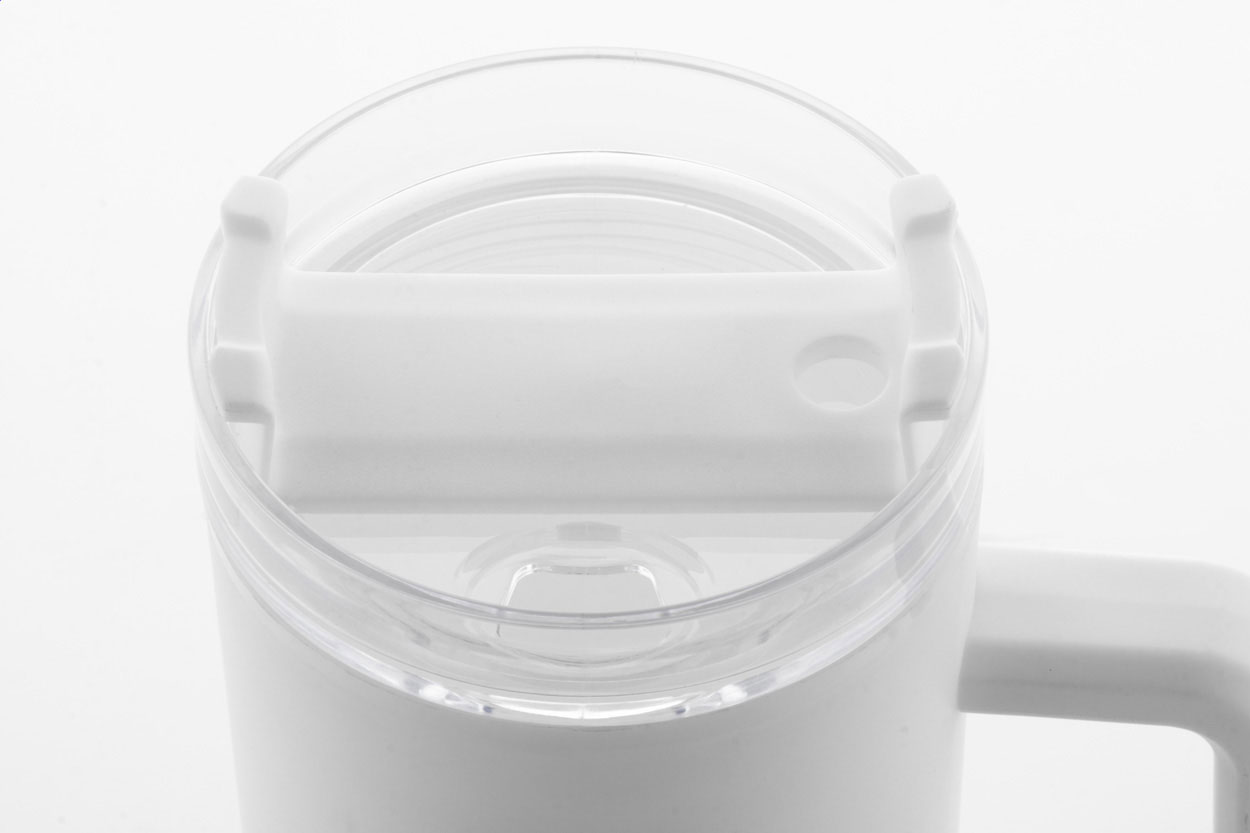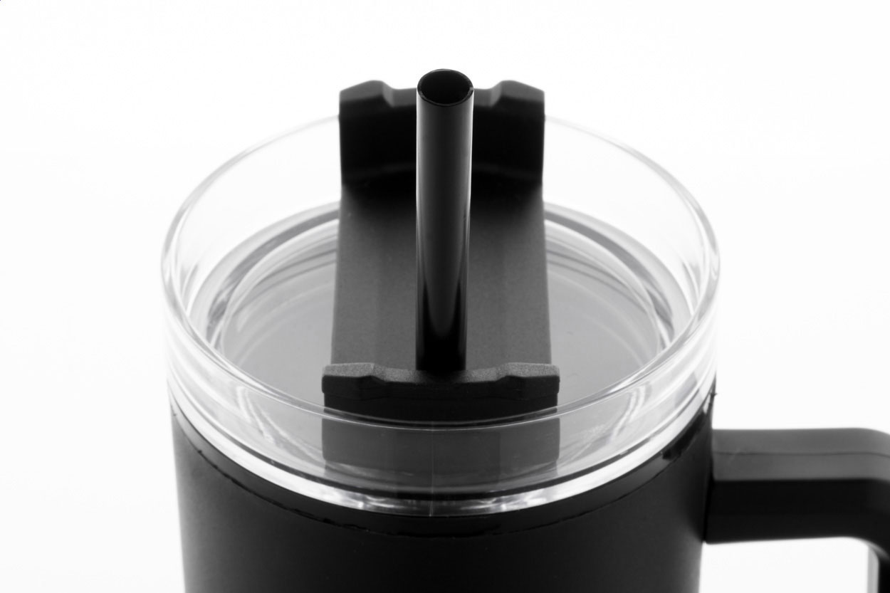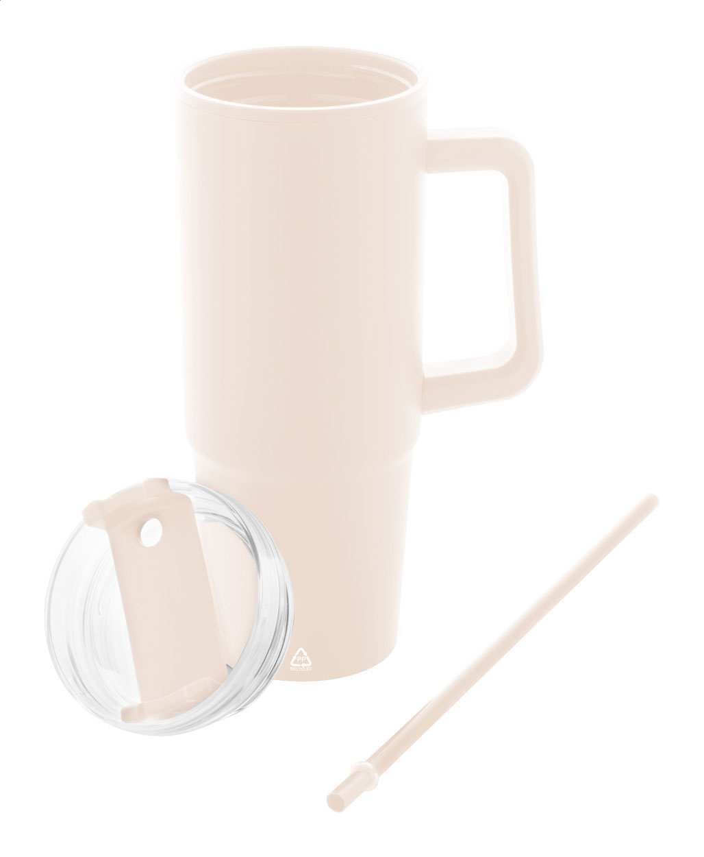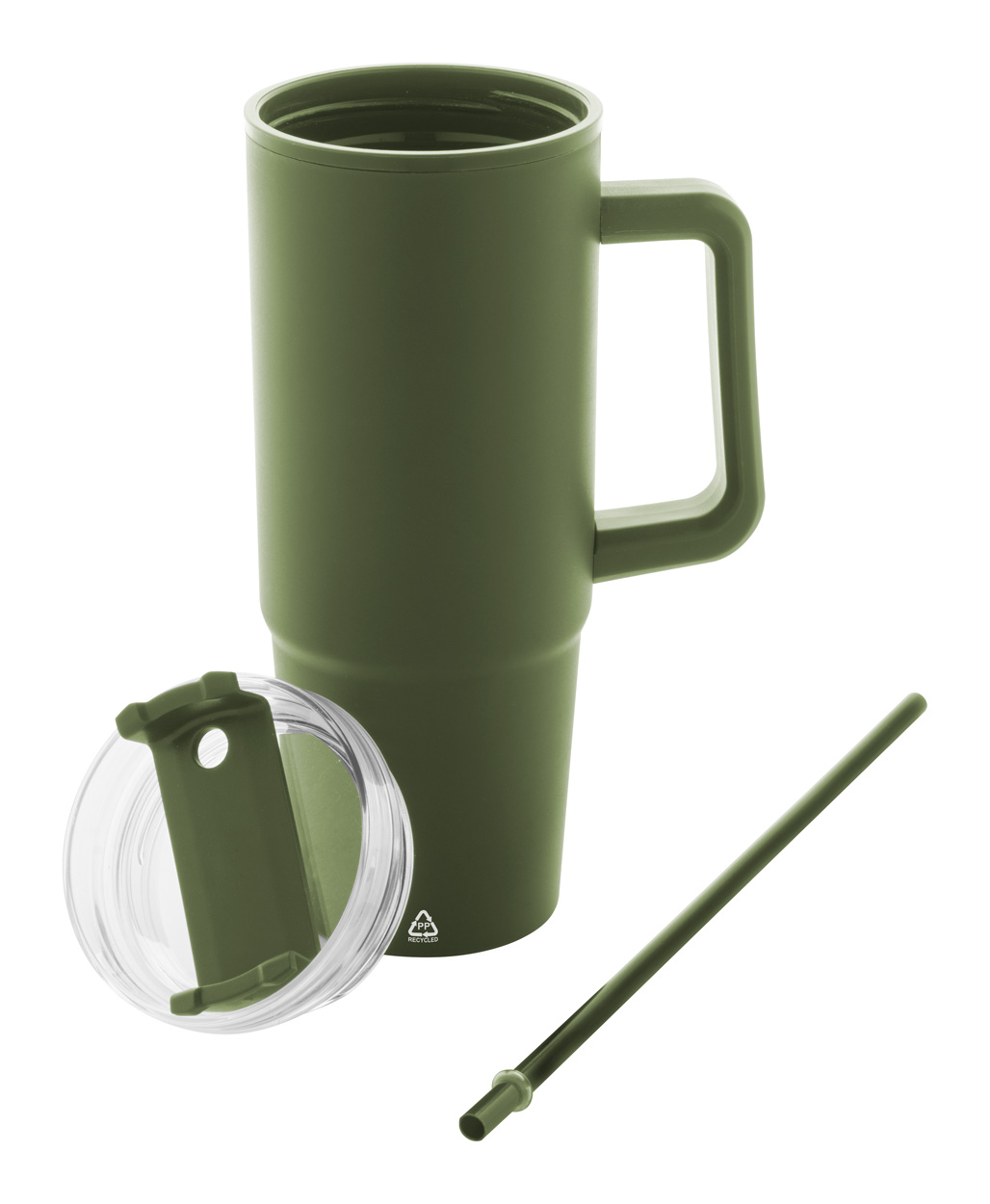 Tazza termica da 900ml. in plastica PP riciclata a doppia parete con struttura termica sottovuoto, coperchio erogatore e cannuccia.