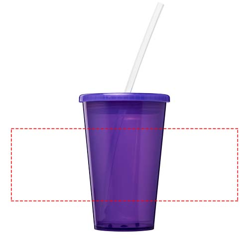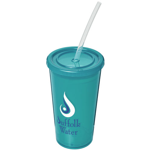Bicchiere termico traslucido a doppia parete. Fornito con una cannuccia in polietilene. Capacità di 350 ml. Prodotto nel Regno Unito. Conforme alla normativa EN12875-1 e lavabile in lavastoviglie.