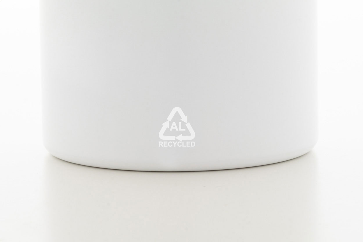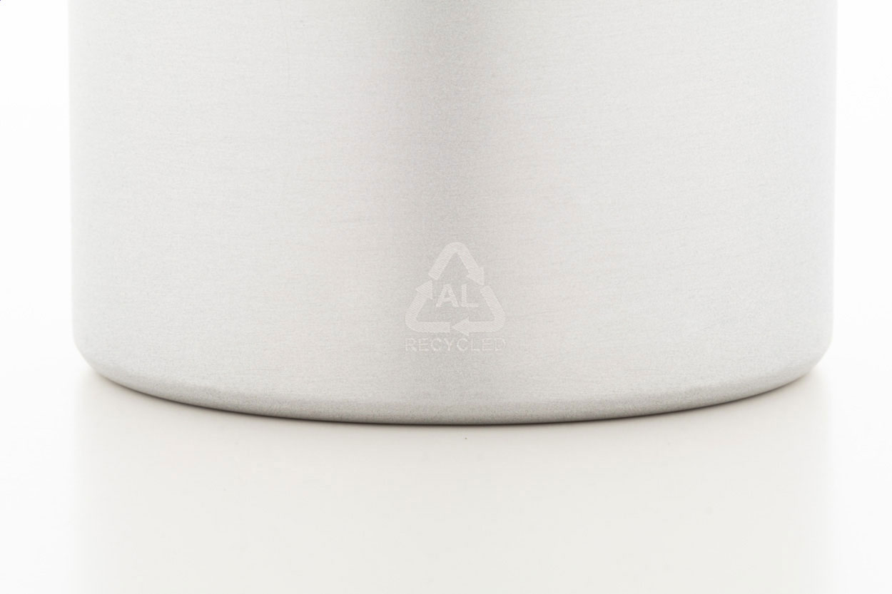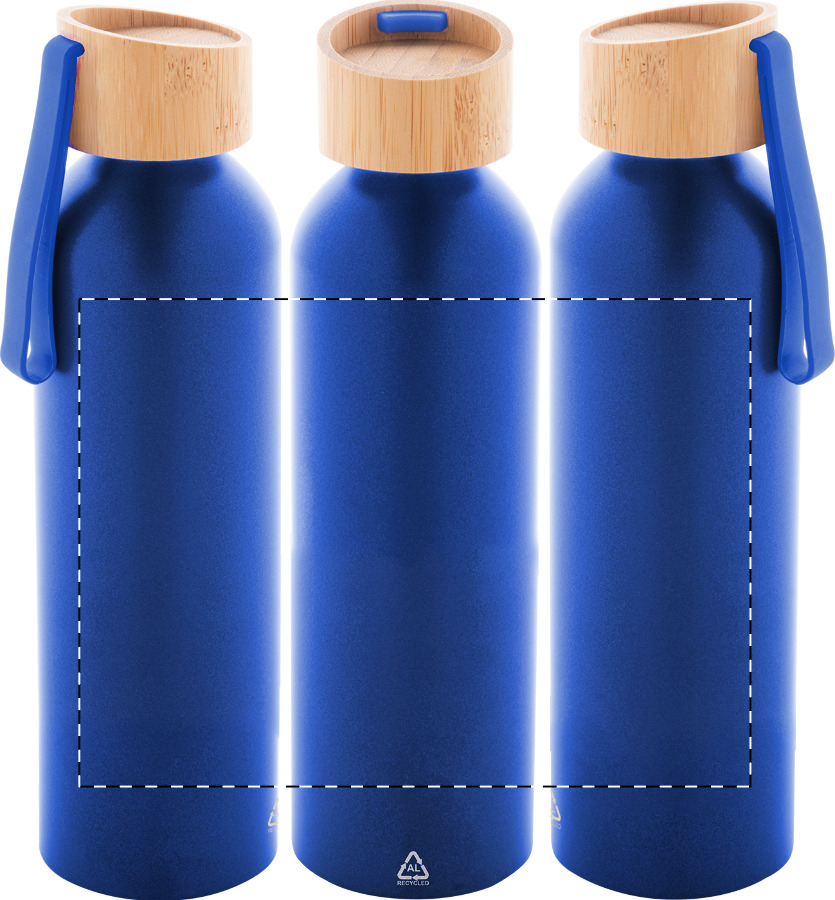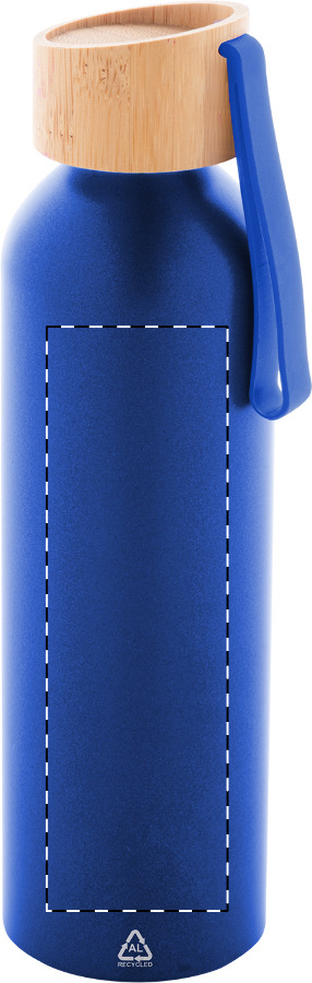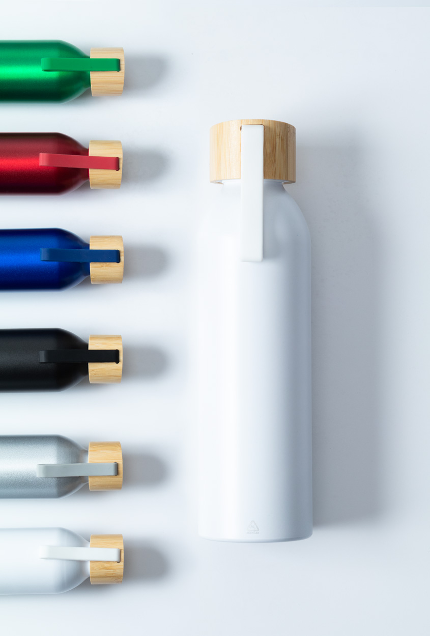 Borraccia da 600ml. in alluminio riciclato con coperchio in bambù e tracolla in silicone di colore coordinato.