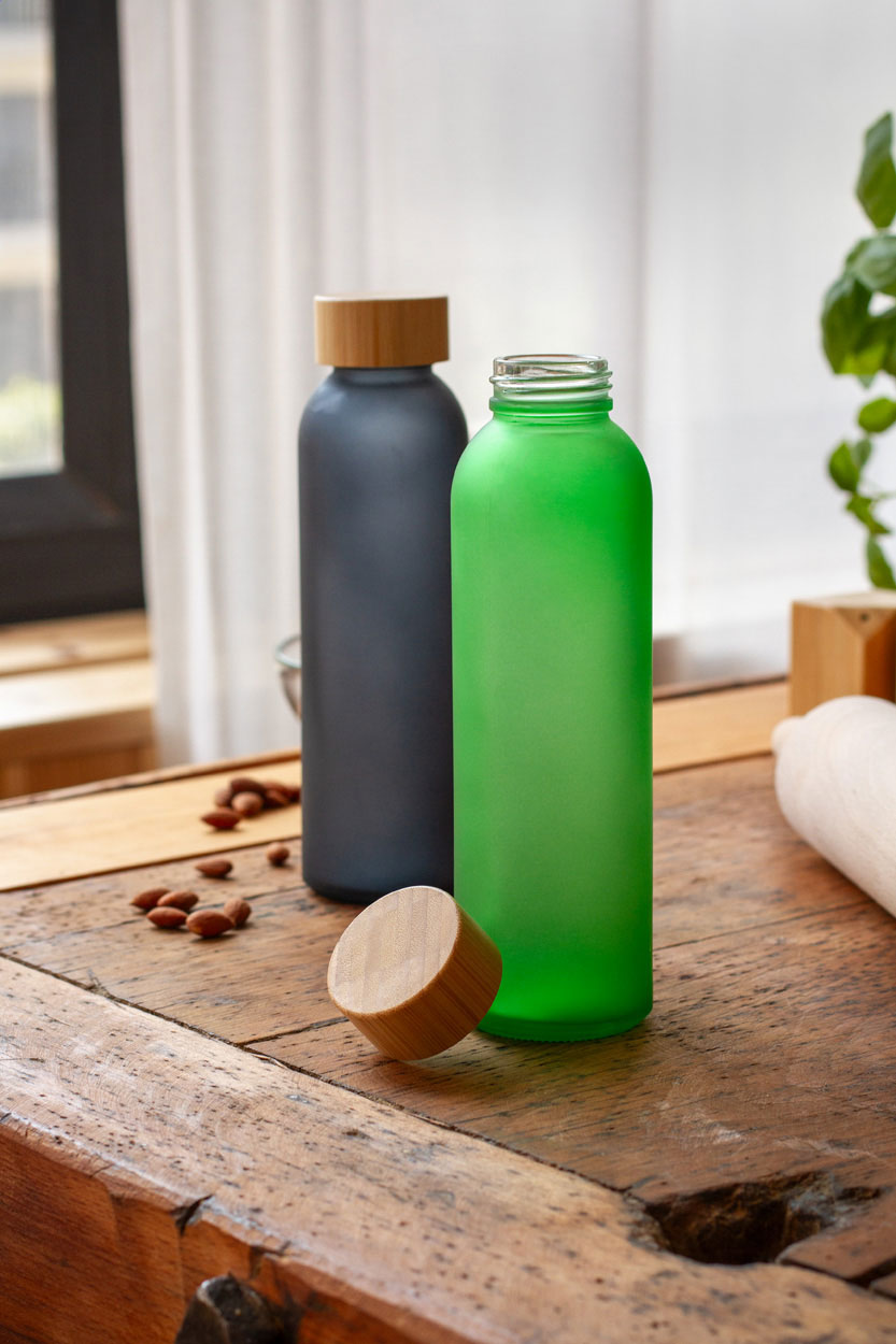 Borraccia in vetro smerigliato da 500 ml. con tappo in bambù. Non adatta per l'utilizzo con bevande gassate.