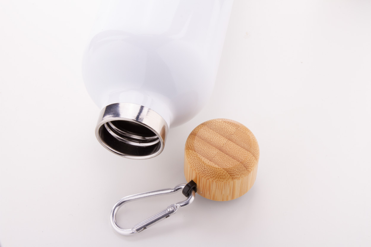 Borraccia termica da 500ml. in acciaio a doppia parete con tappo in bambù e moschettone.