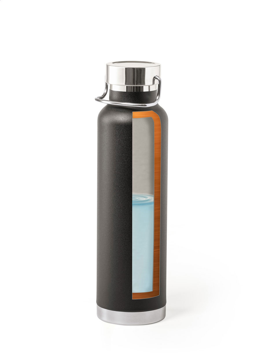 Borraccia termica da 650ml. in acciaio a doppia parete con isolamento in rame che permette di mantenere il contenuto caldo per 12 ore e freddo per 24.
