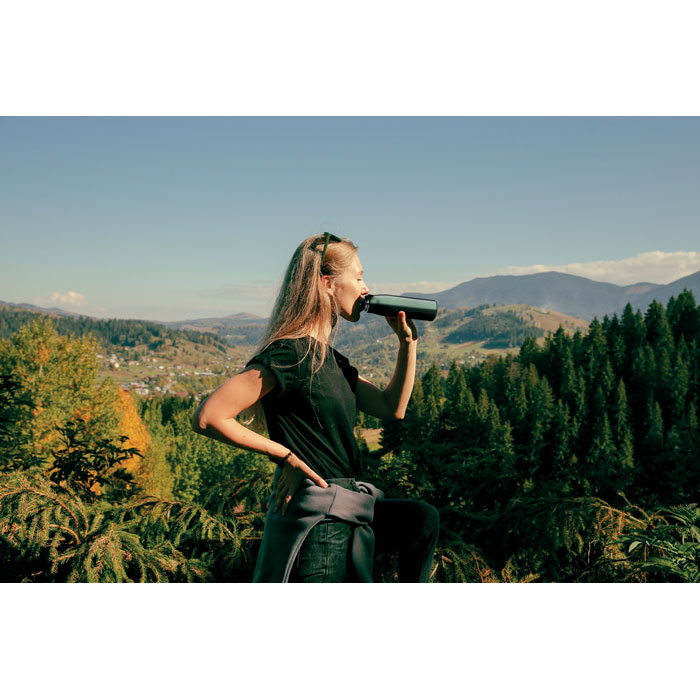 Borraccia sottovuoto isolata a doppio strato in acciaio inox riciclato (90% acciaio inox riciclato e 10% acciaio inox) con impugnatura a corda integrata sul coperchio in PP. Senza perdite. Capacità: 500 ml.