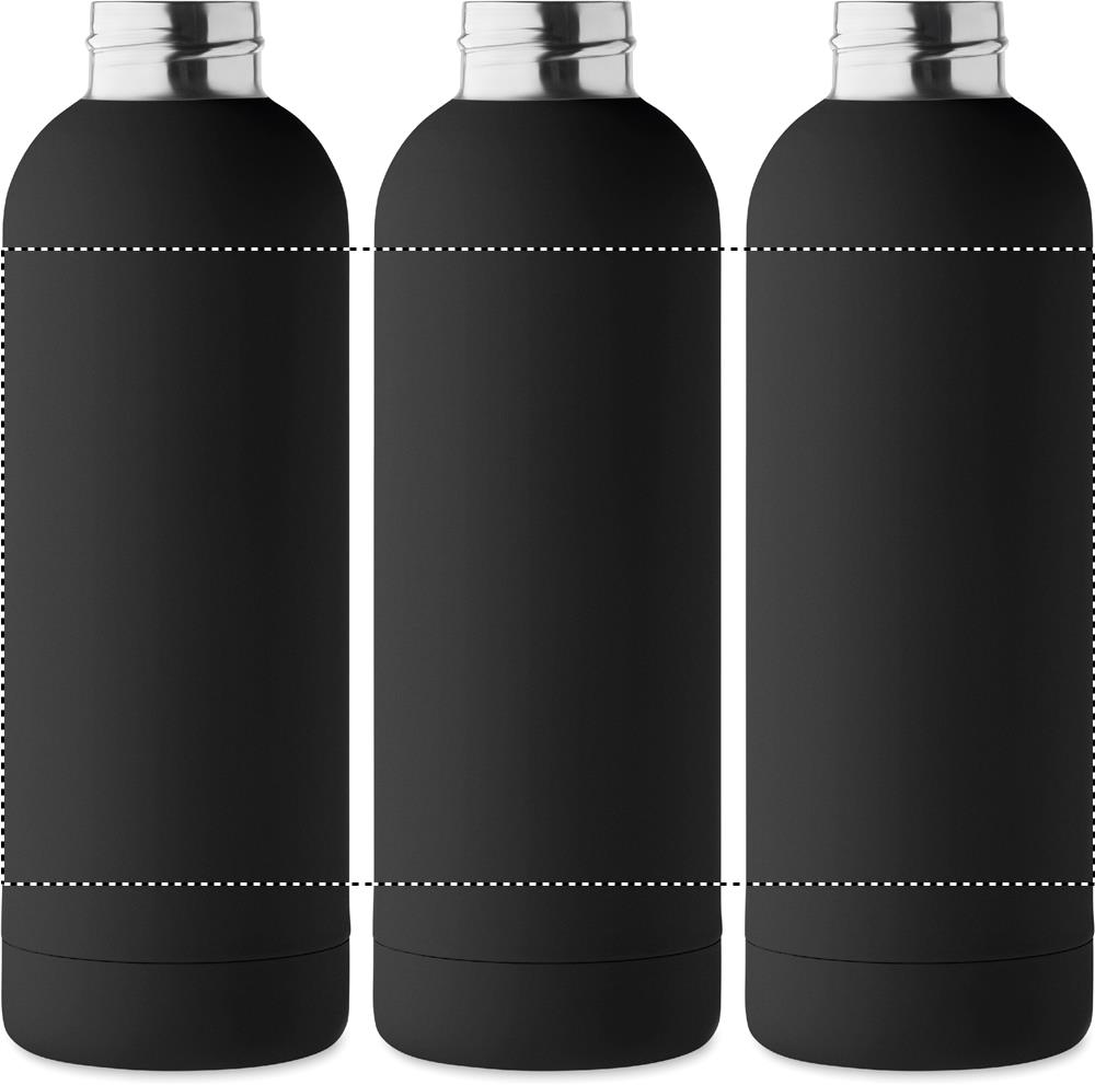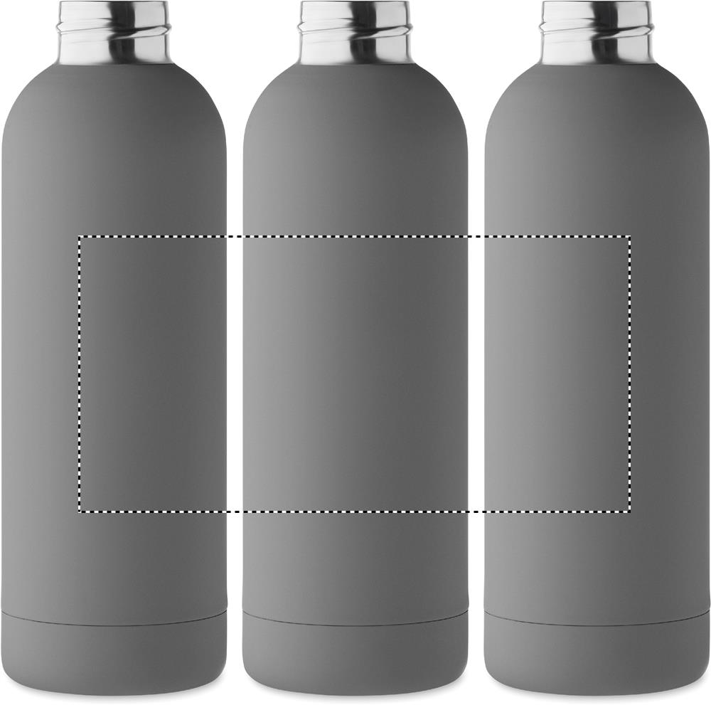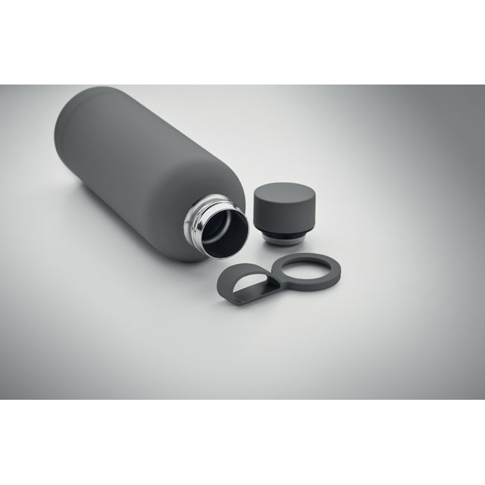 Borraccia isolante doppio strato in acciaio inox riciclato (90% acciaio inox riciclato e 10% acciaio inox) con finitura in gomma e manico in silicone. Capacità: 500 ml.