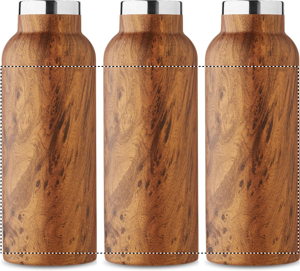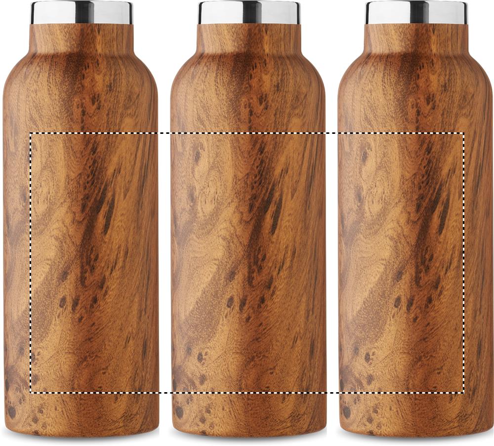 Borraccia sottovuoto isolante a doppio strato, acciaio inossidabile riciclato (90% acciaio inox riciclato e 10% acciaio inox), simil legno e coperchio con manico. Senza perdite. Capacità: 500 ml.