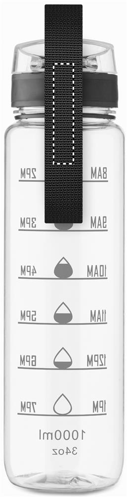Borraccia sportiva in RPET, con indicatori di tempo motivazionali, coperchio flip top apribile con una sola mano, chiusura di sicurezza e cinghia di trasporto. Senza perdite. Capacità: 1 litro.