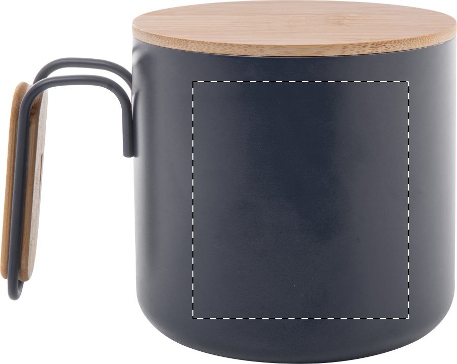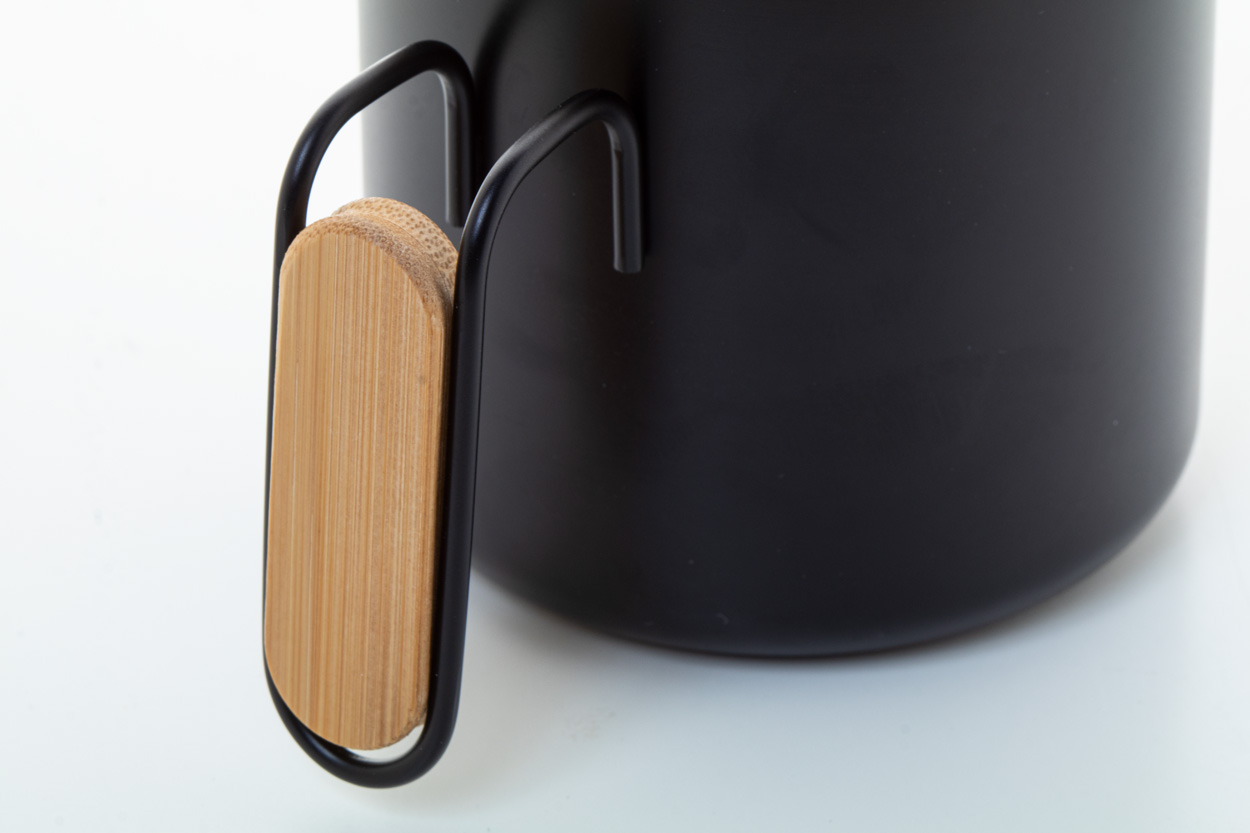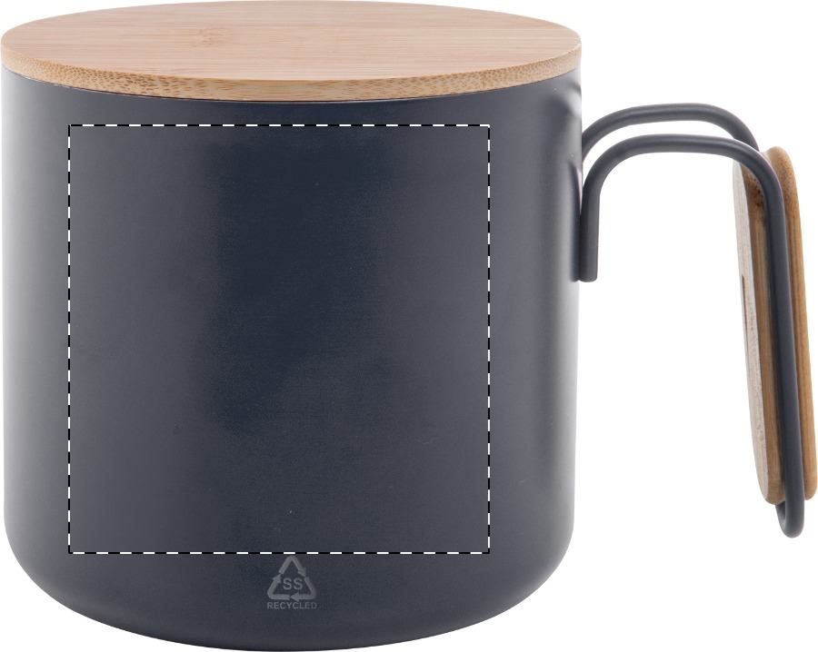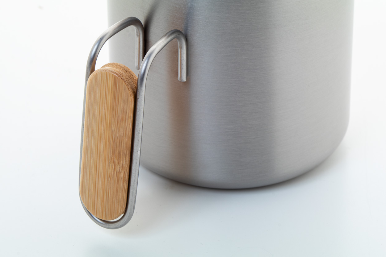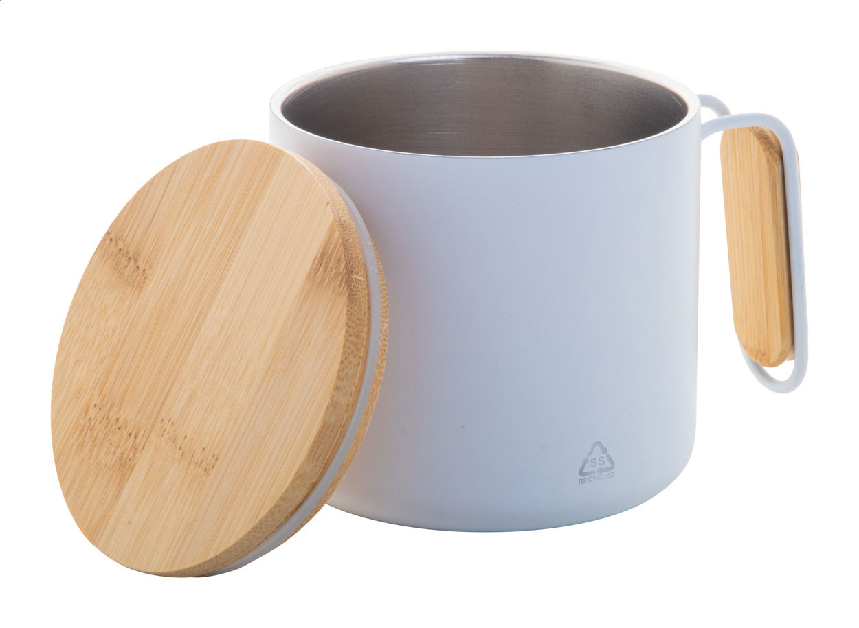 Tazza termica da 300 ml. a doppia parete, in acciaio inox riciclato con coperchio e manico in bambù.