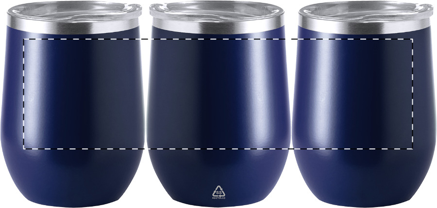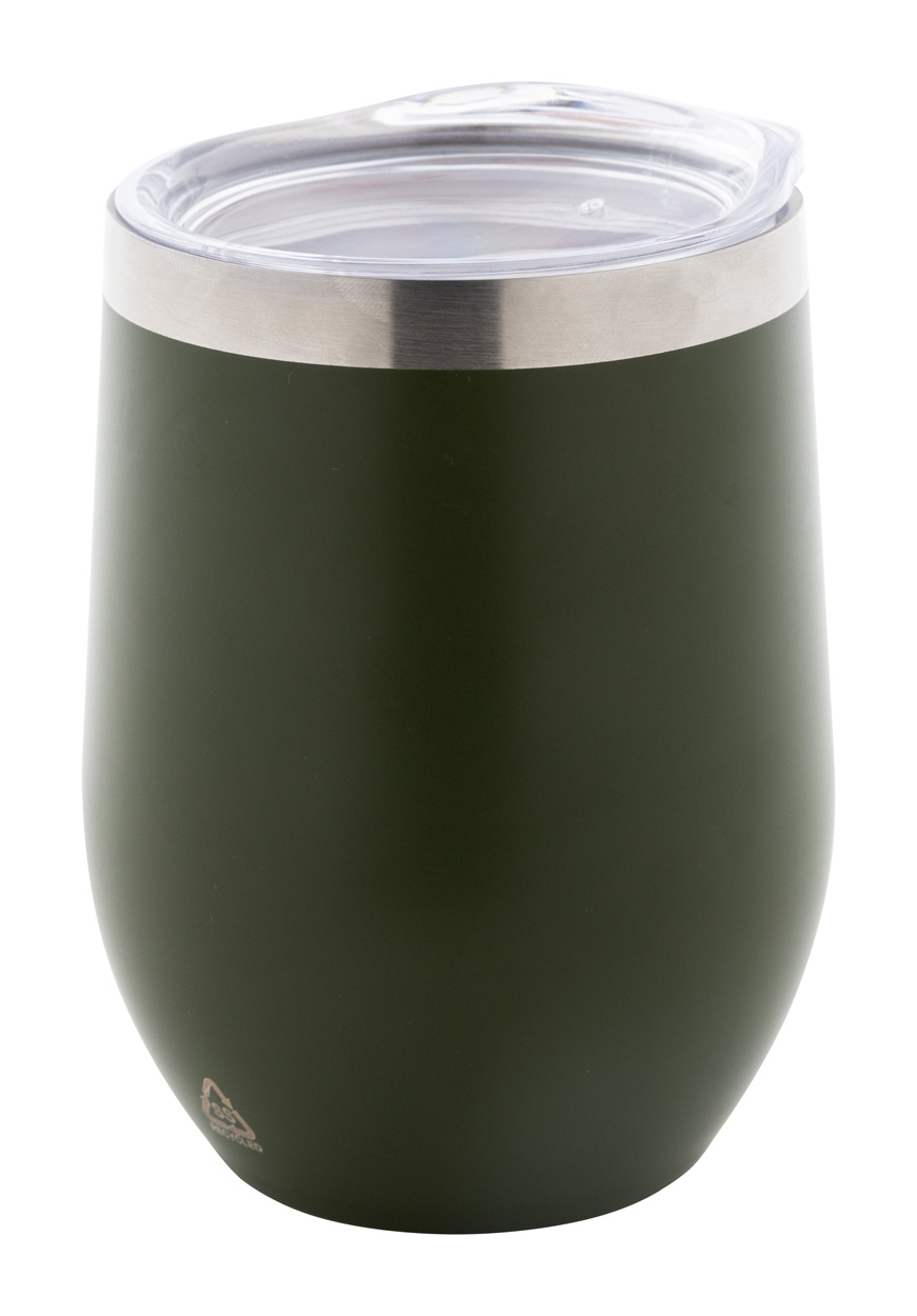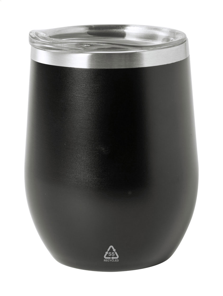 Tazza termica da 350 ml. a doppia parete, in acciaio inox riciclato con coperchio in plastica, senza manico.
