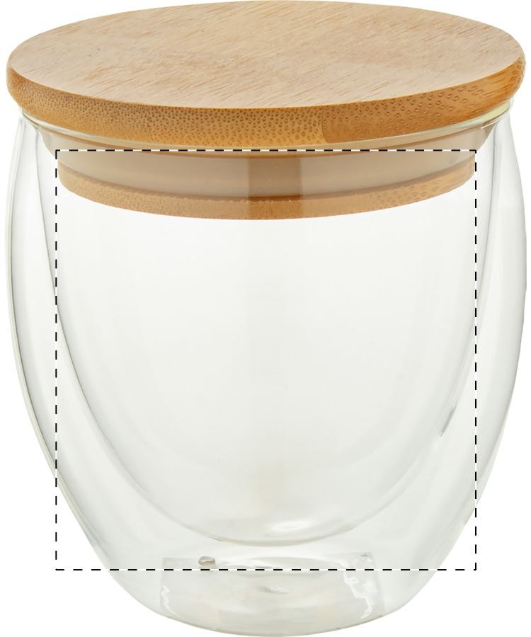 Tazza termica da 300 ml. in vetro borosilicato a doppia parete, con coperchio in bambù e scatola in cartoncino kraft.
