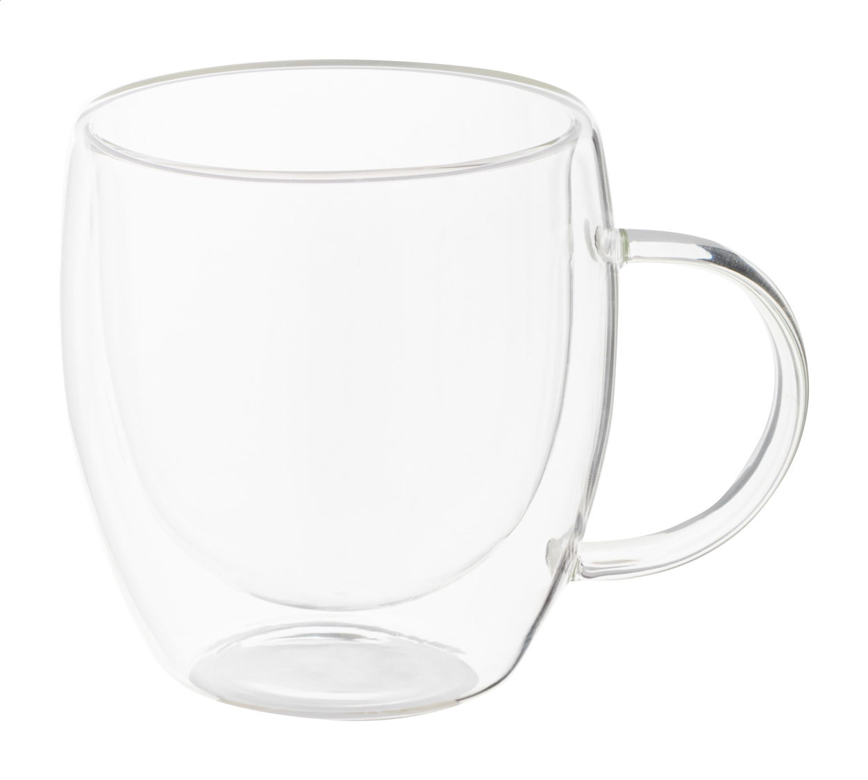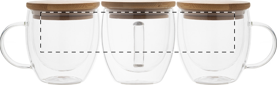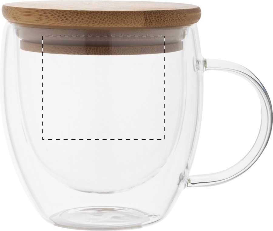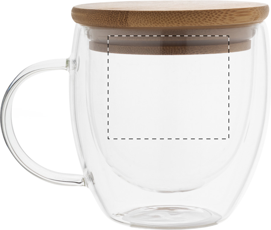 Tazza termica da 250 ml. a doppia parete in vetro borosilicato con manico e coperchio in bambù. Confezione in scatola di cartoncino kraft.