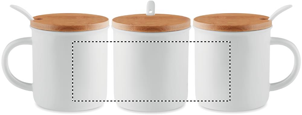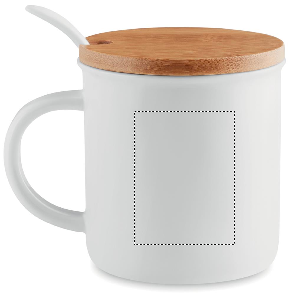 Tazza in porcelana con cucchiano. Coperchio in bamboo. Confezione singola. La tampografia non resiste al lavaggio in lavastoviglie, il transfer su ceramica si. Capacità 380ml. Consegna express inclusa 3-4 gg lavorativi fino a 50 pz.