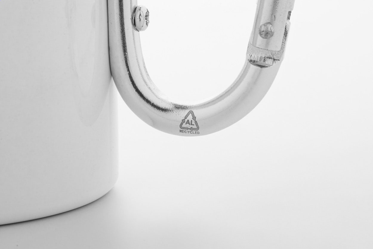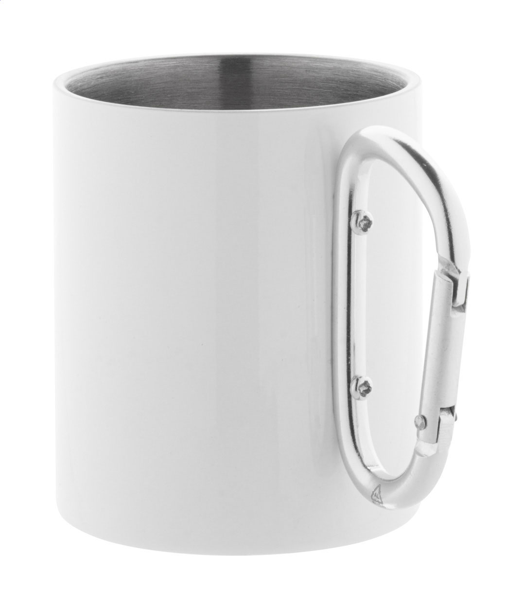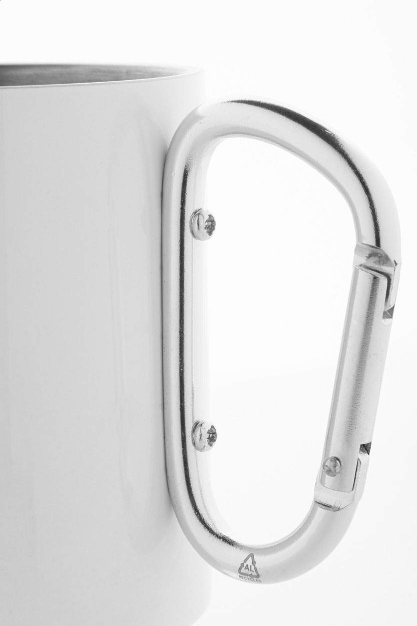Tazza termica per sublimazione da 300ml. in acciaio inox riciclato a doppia parete con manico a moschettone in alluminio riciclato. Confezione in scatola di cartoncino bianco.