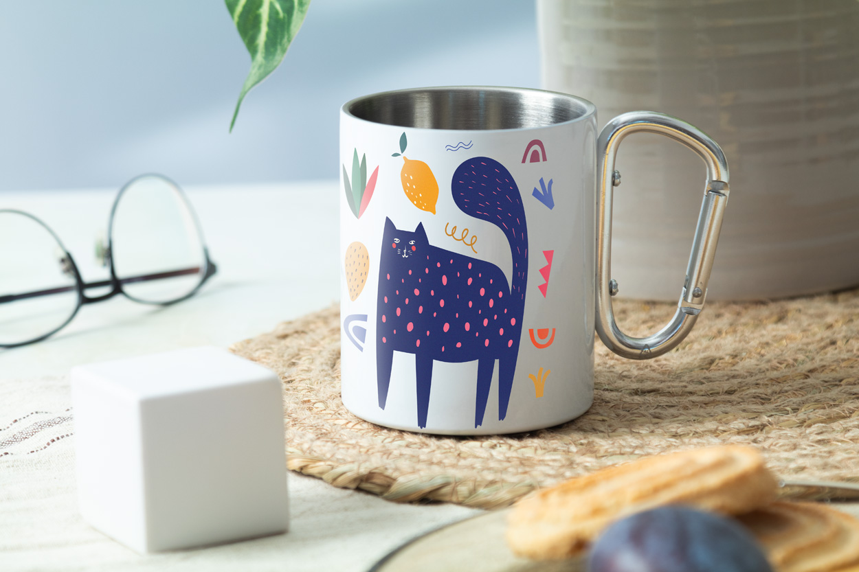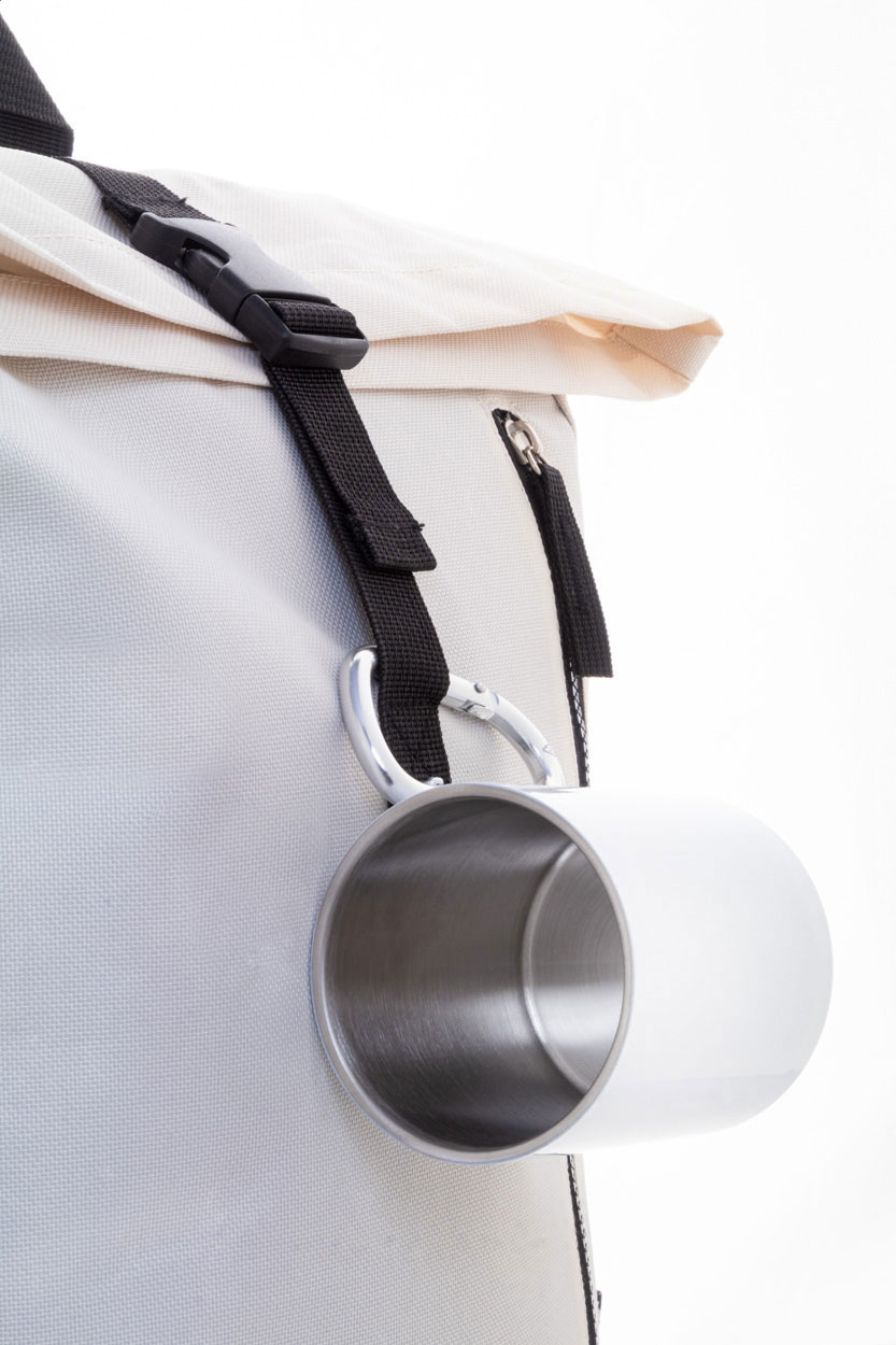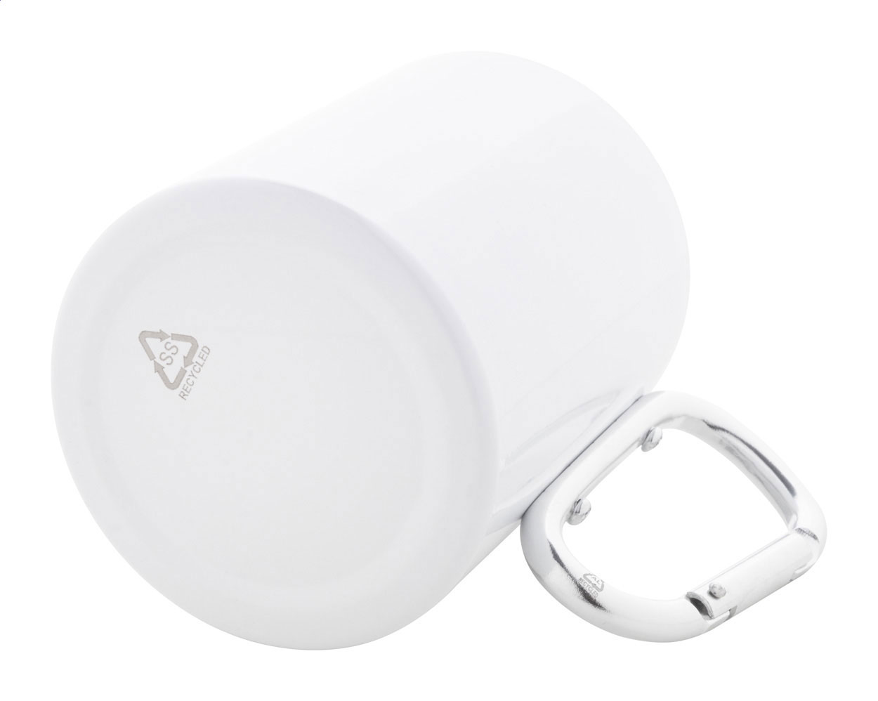Tazza termica per sublimazione da 300ml. in acciaio inox riciclato a doppia parete con manico a moschettone in alluminio riciclato. Confezione in scatola di cartoncino bianco.