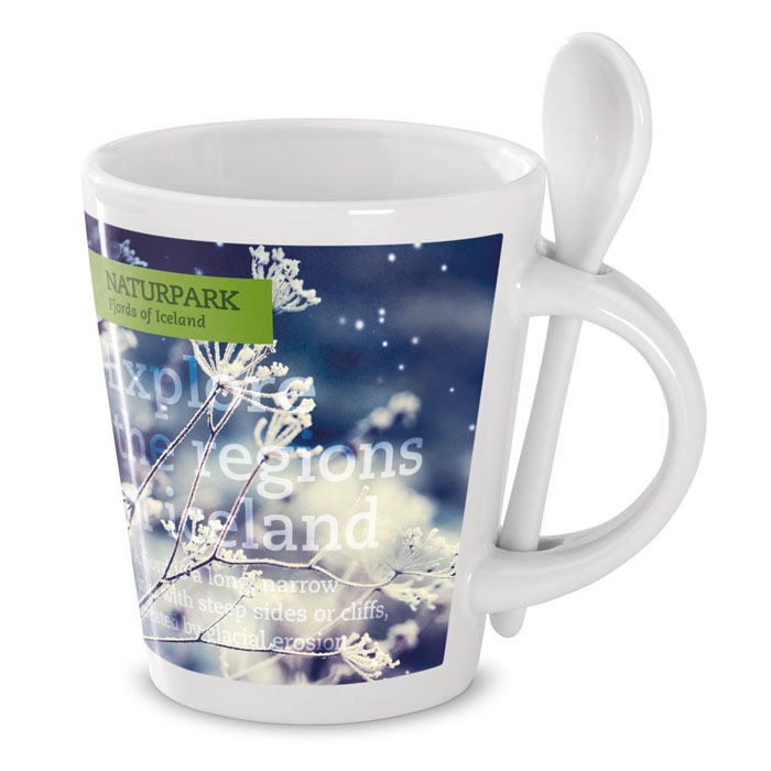 Tazza in porcellana con cucchiaino. Rivestimento speciale indicato per la stampa in sublimazione. Capacità 300 ml.