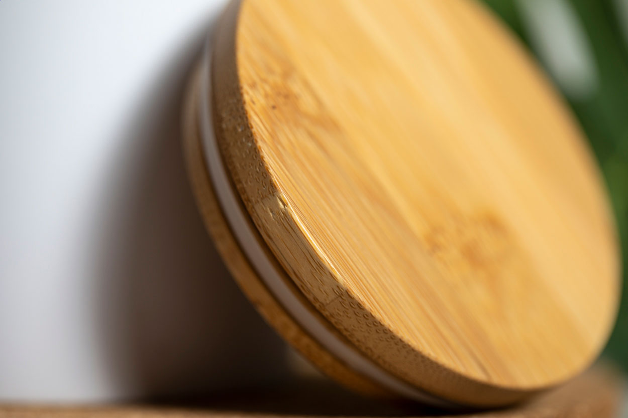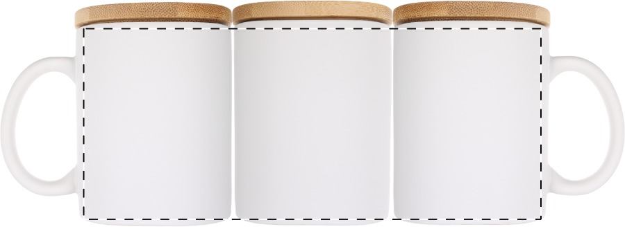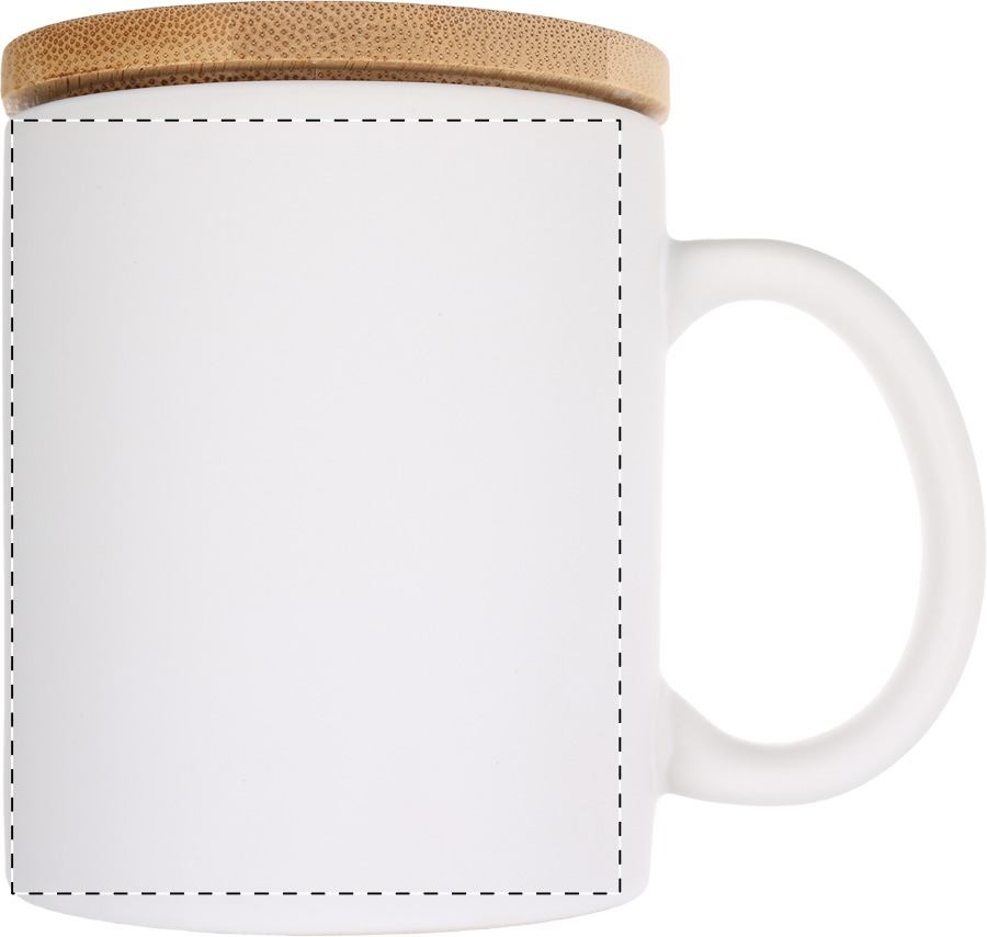 Tazza in ceramica da 370 ml. con finitura opaca e coperchio in bambù. Fornita in confezione di cartoncino kraft.