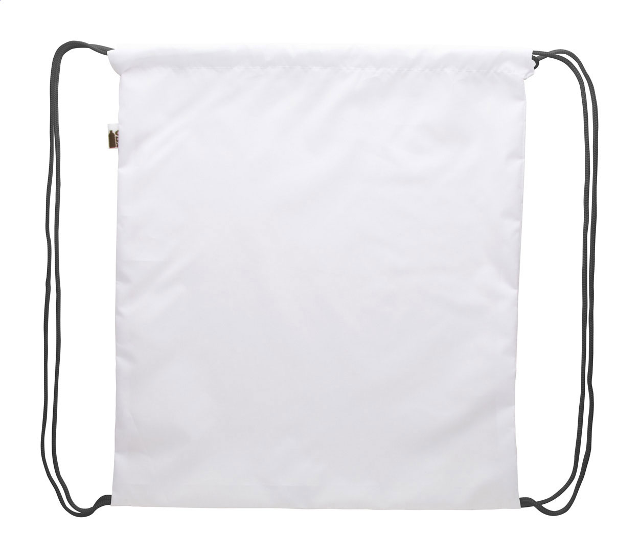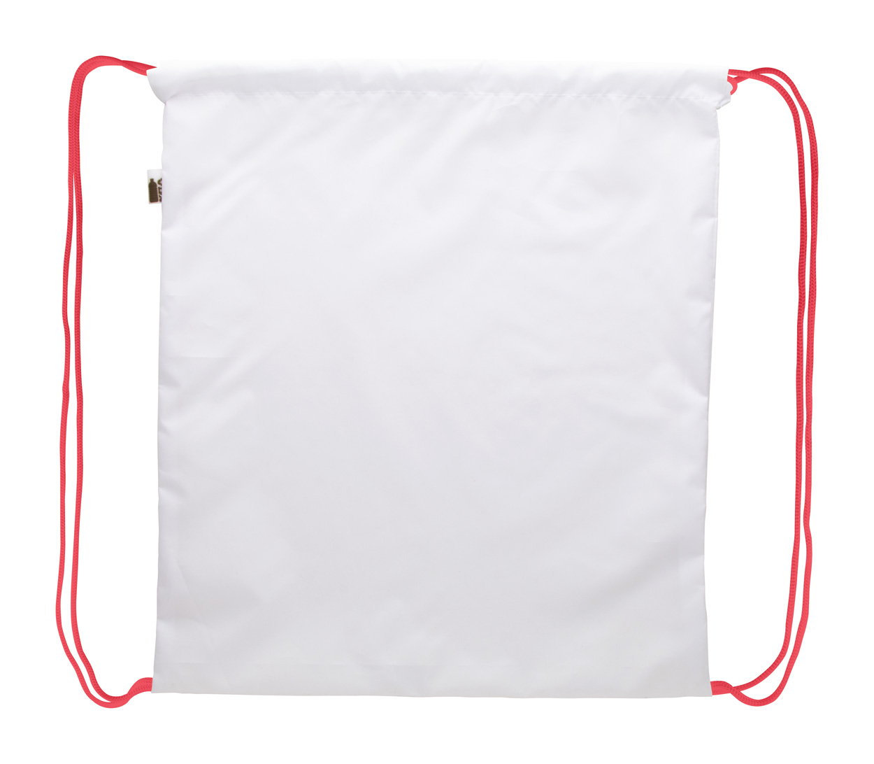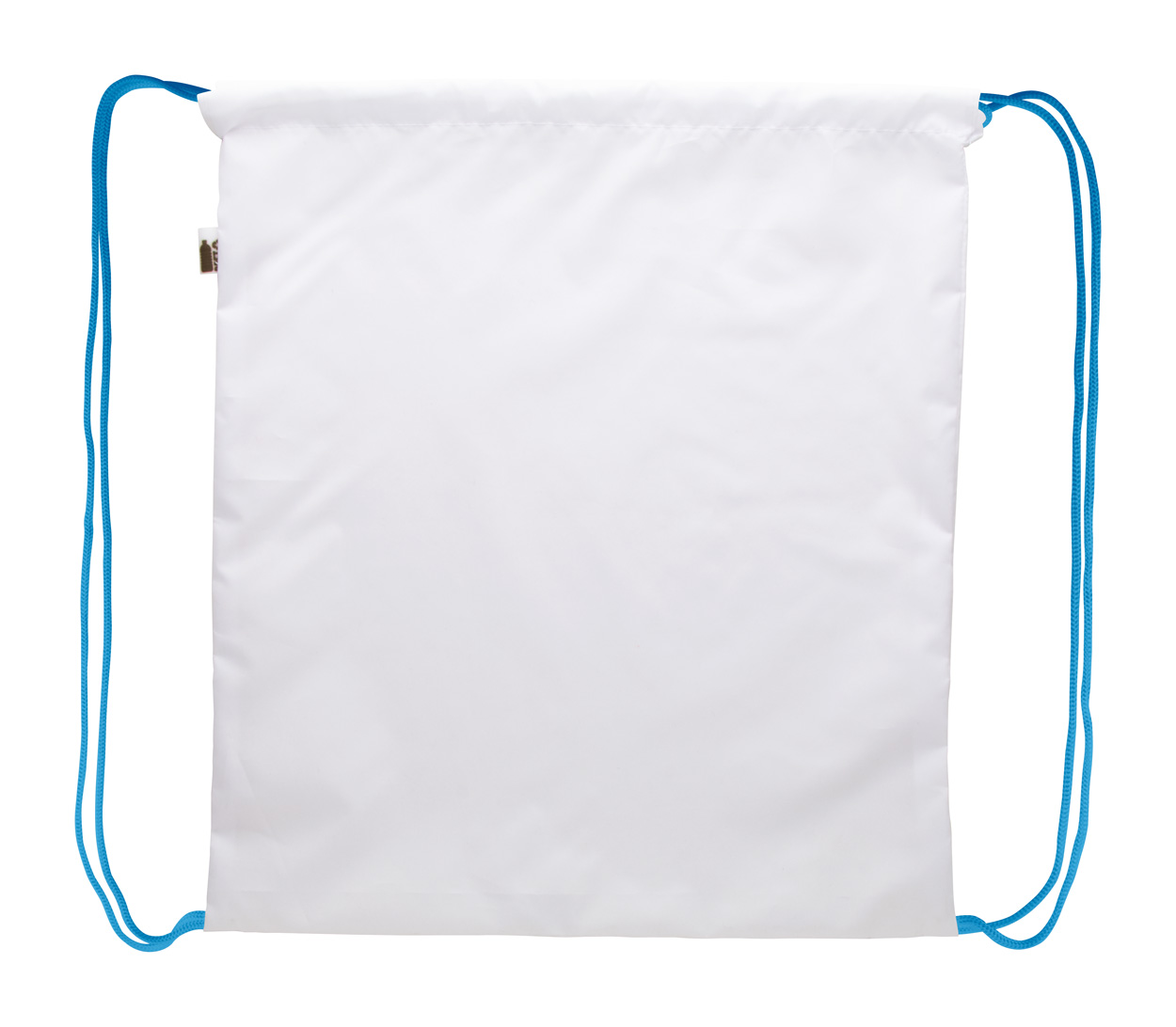 Sacca personalizzabile con chiusura a coulisse e cordoncini colorati, materiale poliestere 190T RPET. Grafica stampata in sublimazione su tutta la superficie ed etichetta RPET. MOQ: 25 pz.