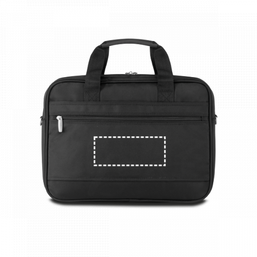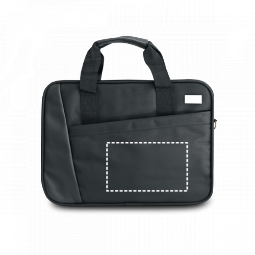 Porta computer in similpelle e 1680D. Interno foderato imbottito con divisorio imbottio per computer fino 15,6". Scomparto con varie tasche, 1 tasca frontale, 1 tasca posteriore e una placca personalizzabile.Fascia nel retro per trasporto trolley e tracolla regolabile con rinforzo imbottito