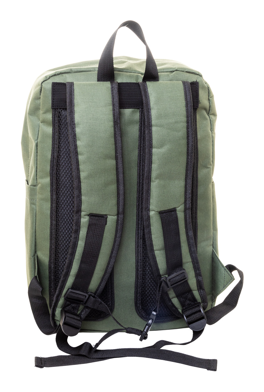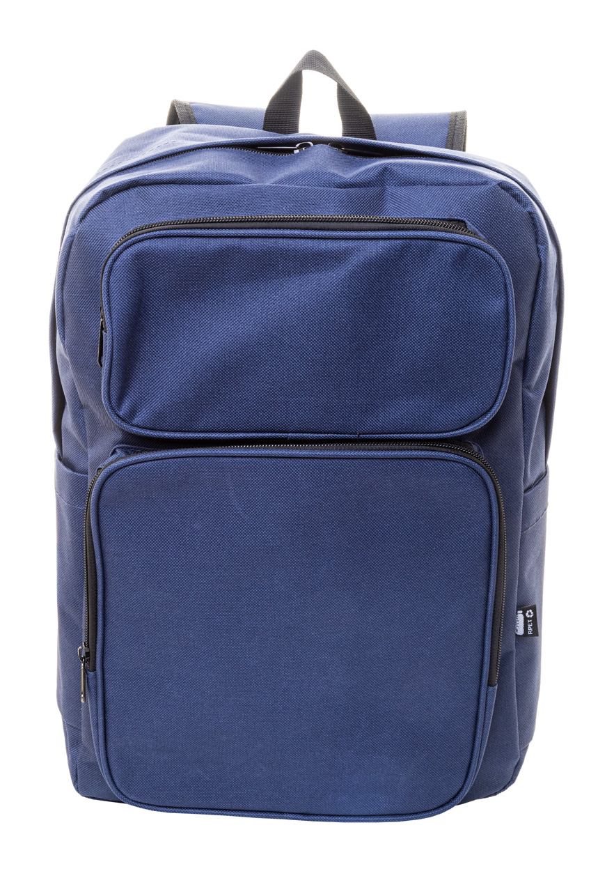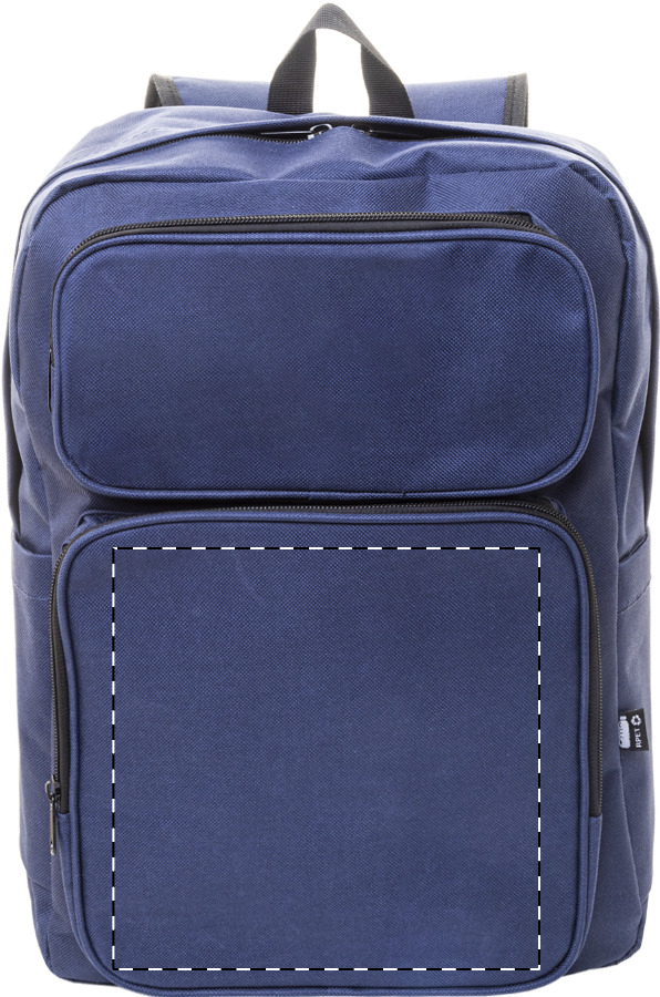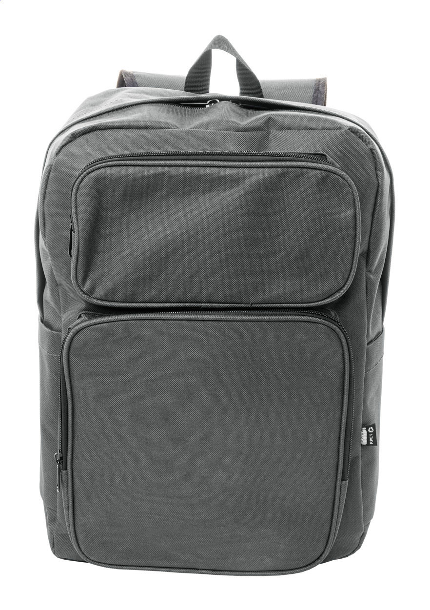 Zaino in poliestere 600D RPET con scomparto principale e 2 tasche chiusi da cerniera, tasca laterale, scomparto imbottito per laptop (15") e tablet (10"), cinghia trolley, schienale e spallacci imbottiti ed etichetta RPET.