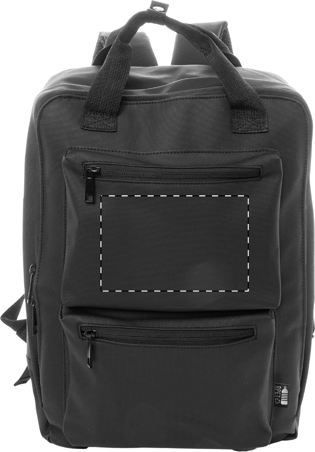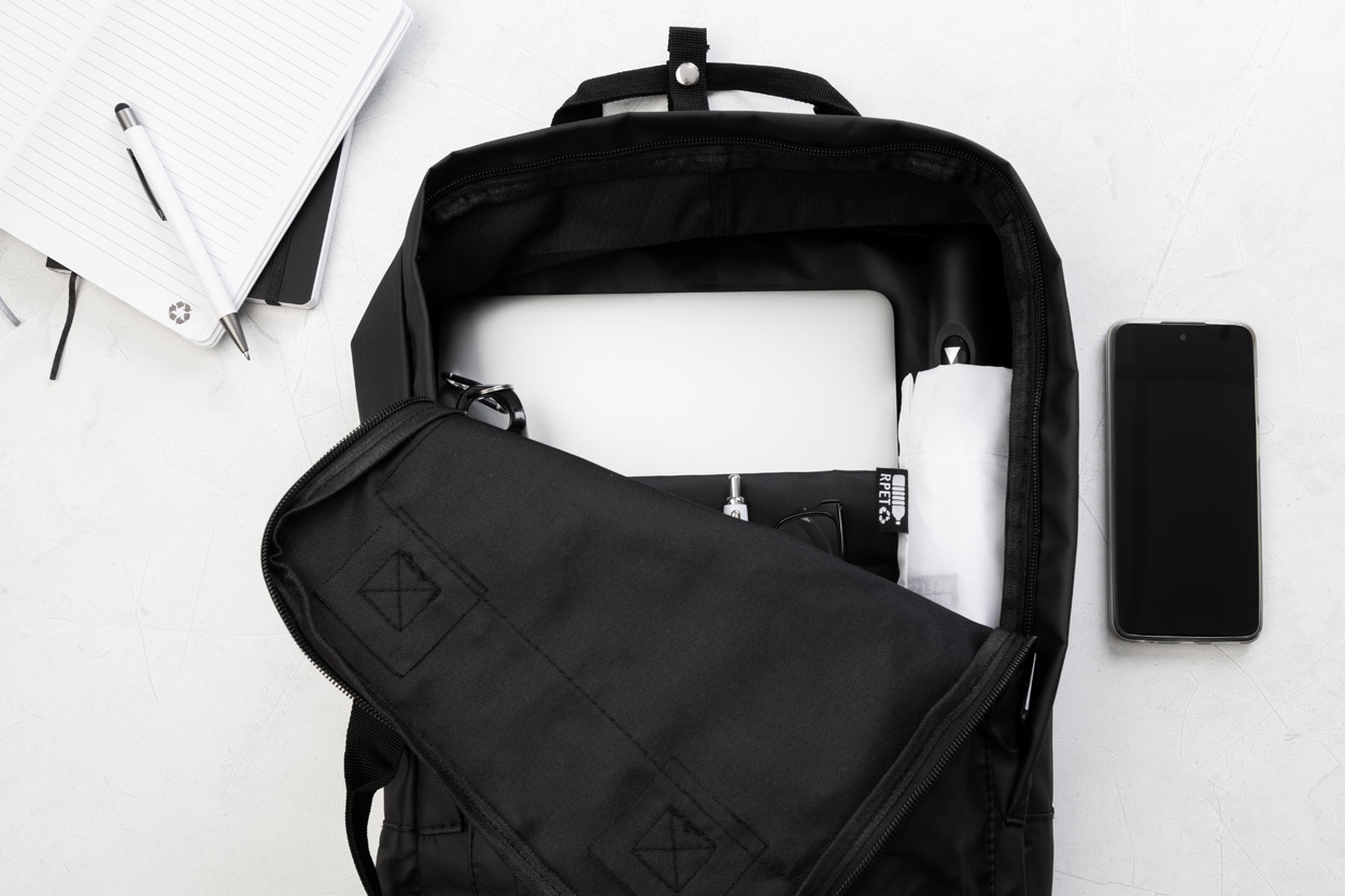 Zaino impermeabile in morbida pelle PU riciclata con scomparto principale e 2 tasche anteriori chiusi da cerniera, tasche laterali, scomparto imbottito per laptop (15“) e tablet (10”), schienale e spallacci imbottiti ed etichetta PU riciclato.