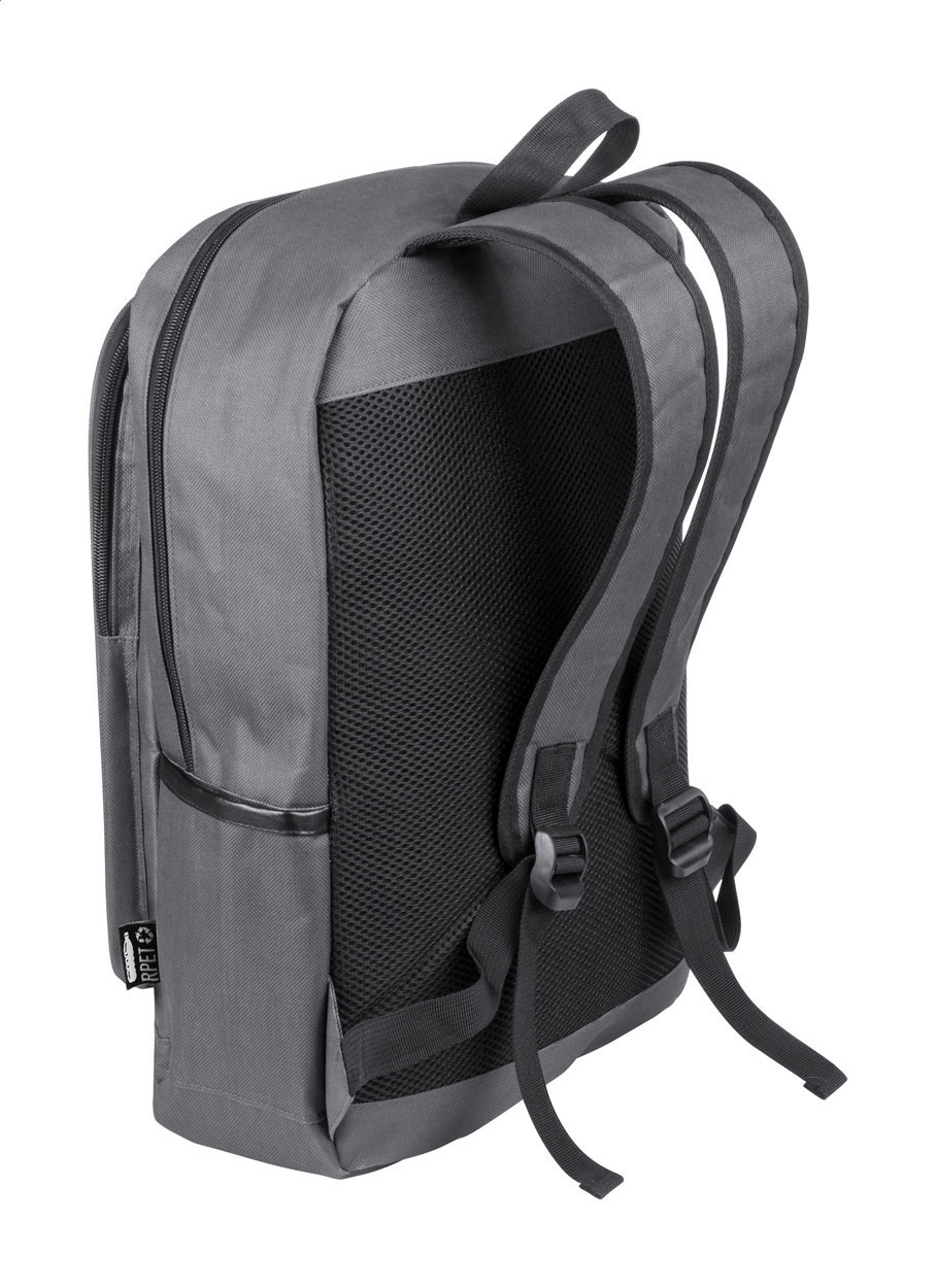 Zaino in poliestere 600RPET con scomparto principale e 2 tasche anteriori chiusi da cerniera, tasche laterali, scomparto imbottito per laptop (15"), schienale e spallacci imbottiti ed etichetta RPET.