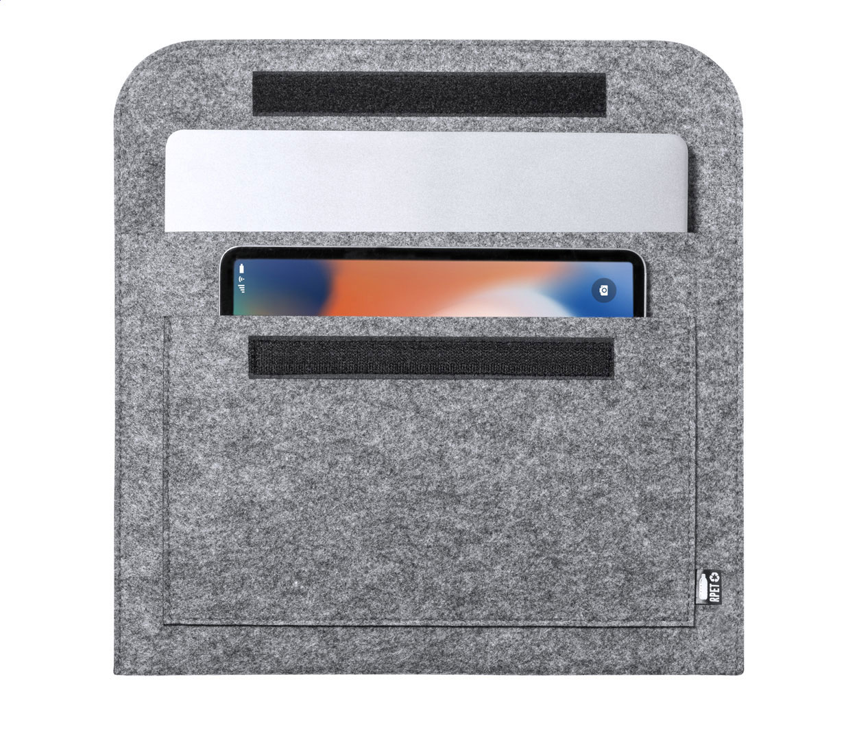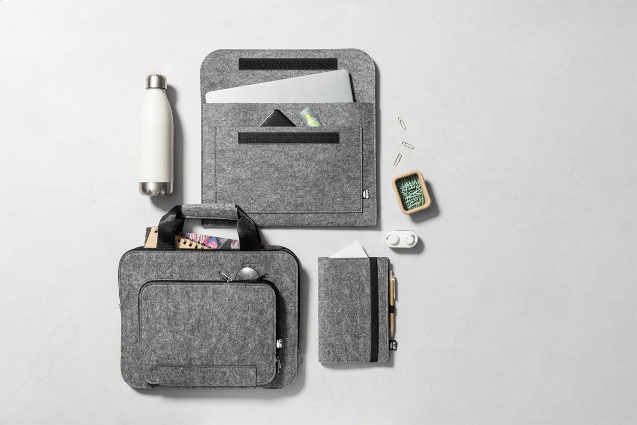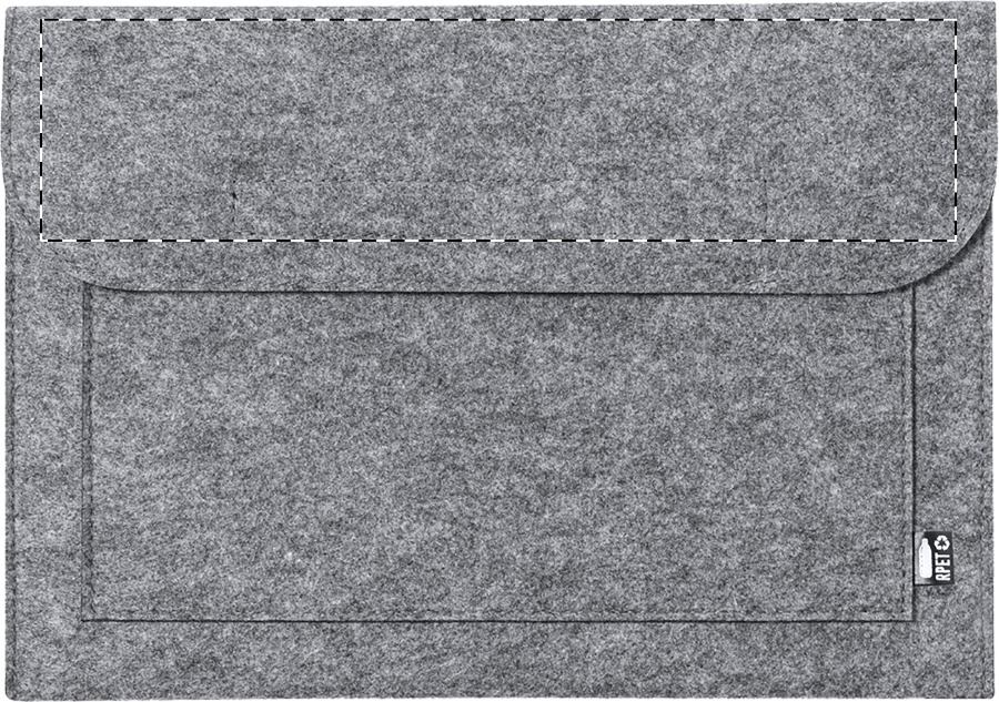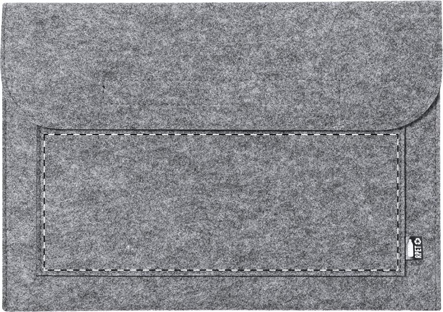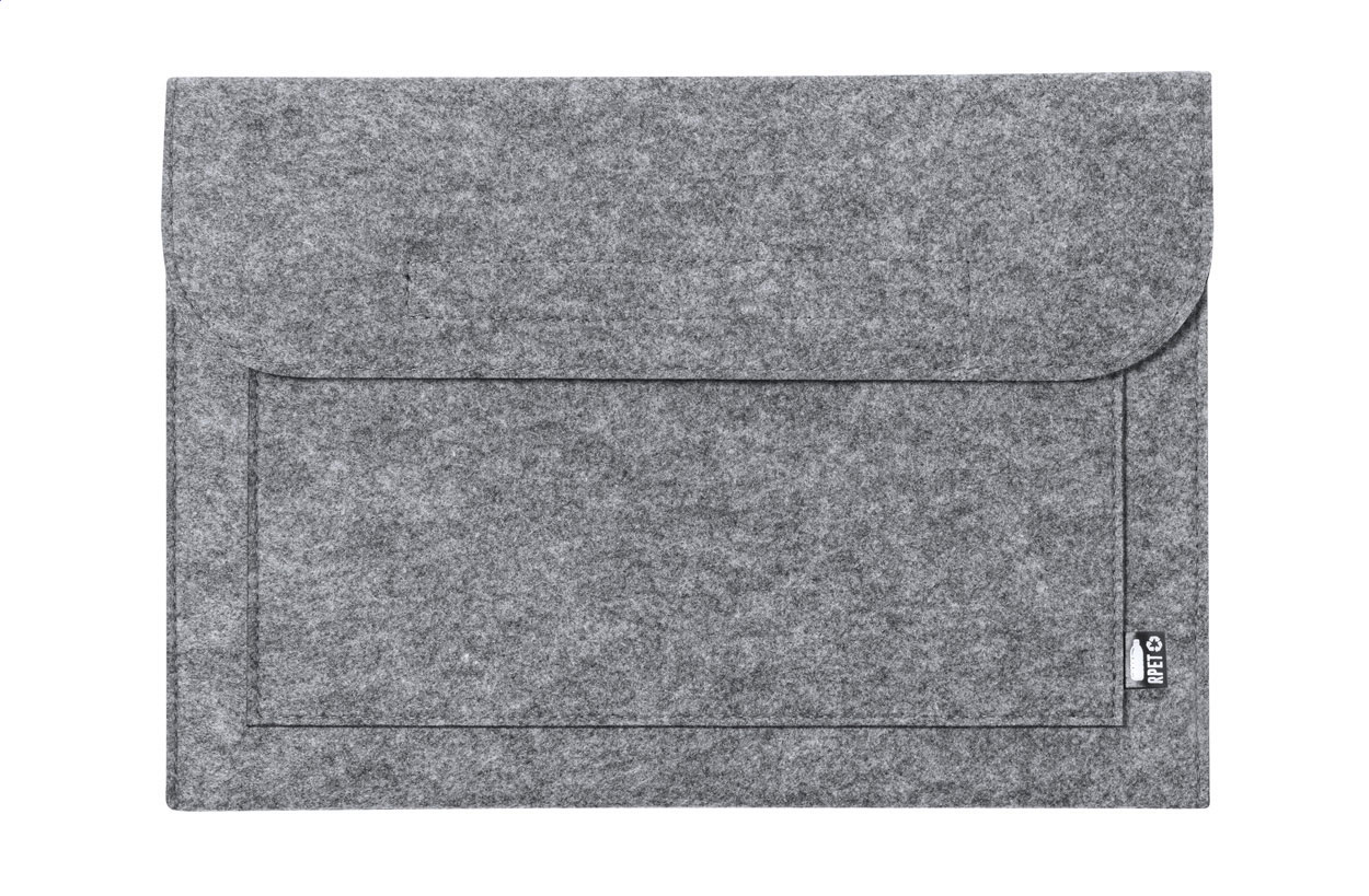 Cartella per computer portatile in feltro RPET con tasca frontale, chiusura in velcro ed etichetta RPET.