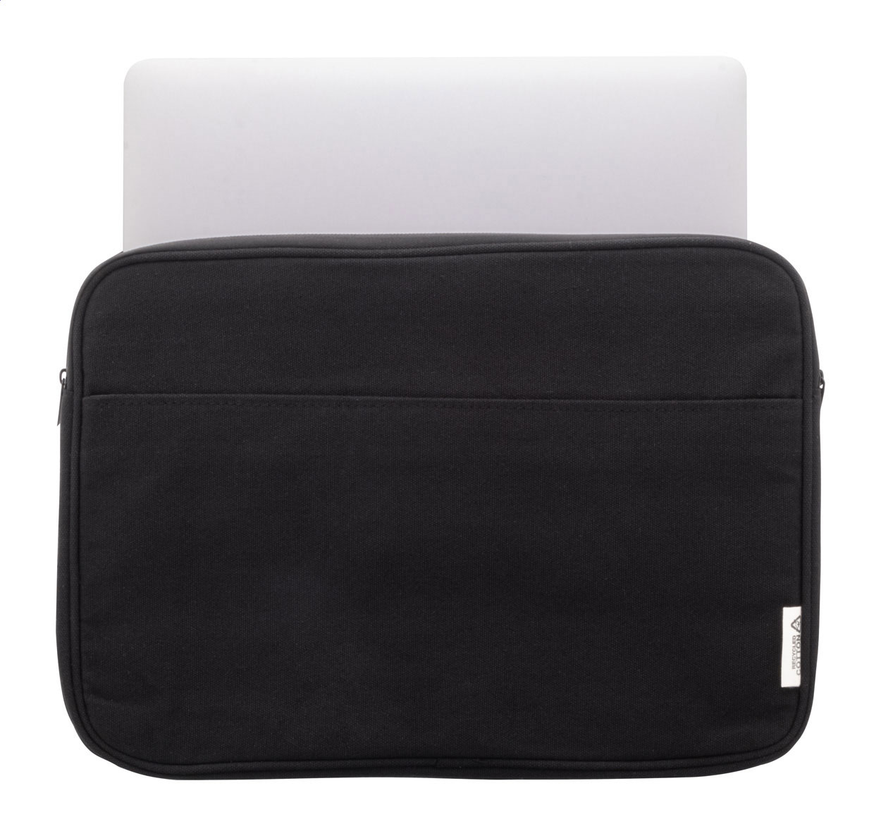 Borsa porta computer in tela riciclata completamente imbottita, con scomparto chiuso da cerniera e tasca frontale. Adatta a computer portatili fino a 15”. 70% cotone riciclato e 30% poliestere RPET. Etichetta cotone riciclato.