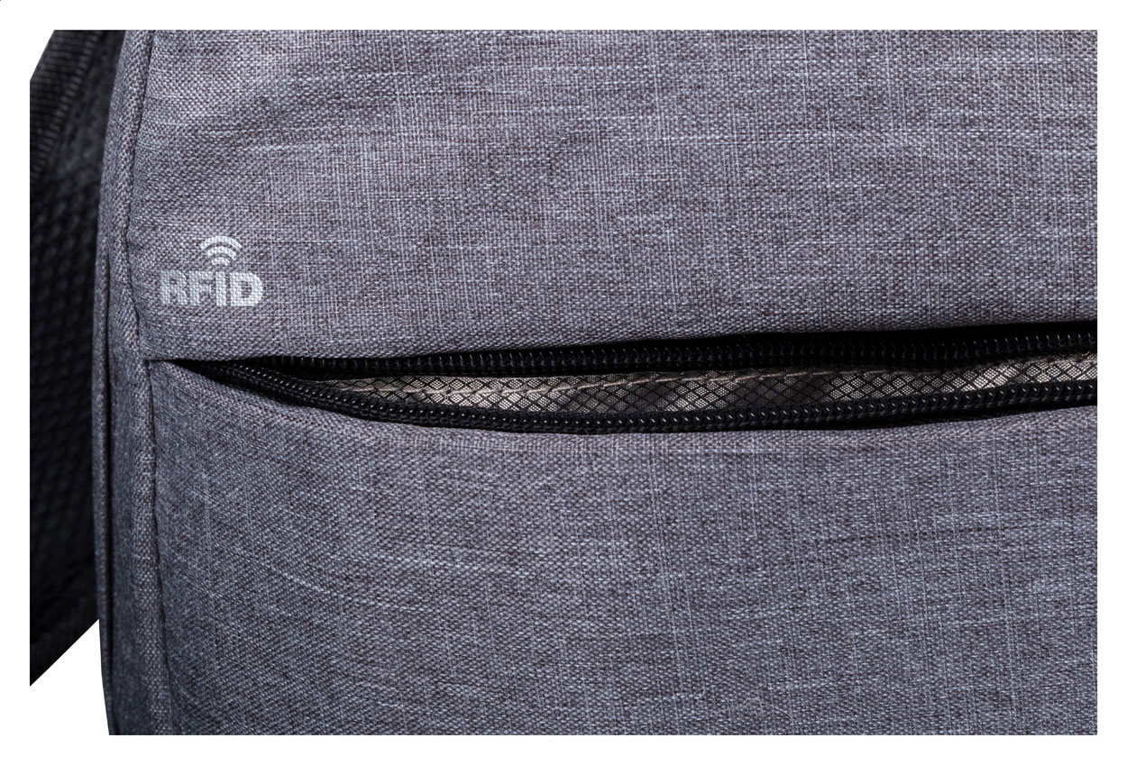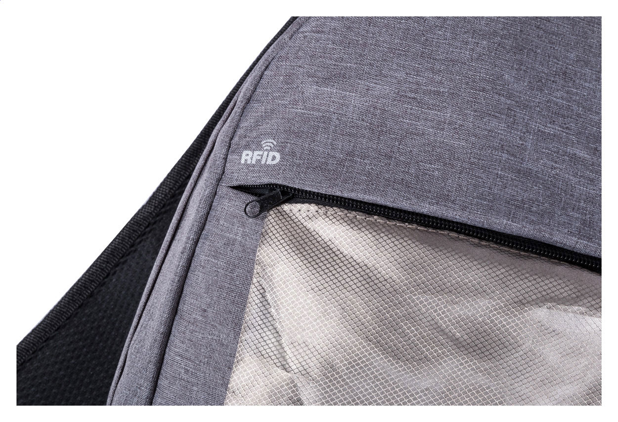 Zaino con protezione RFID, scomparti multipli con zip, scomparto imbottito per computer portatile (15"), schienale imbottito e tracolla. Con connettore USB integrato per power bank. Poliestere 300D.