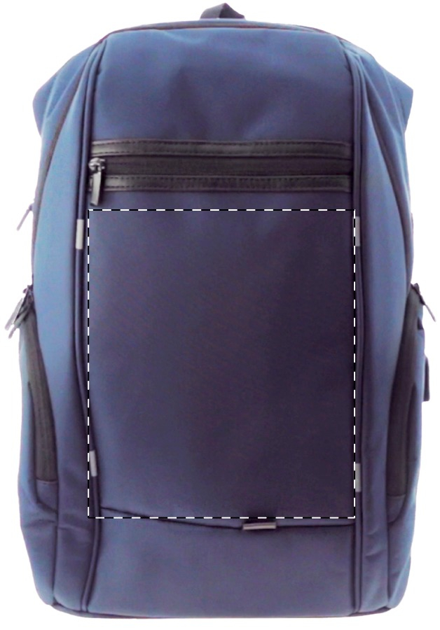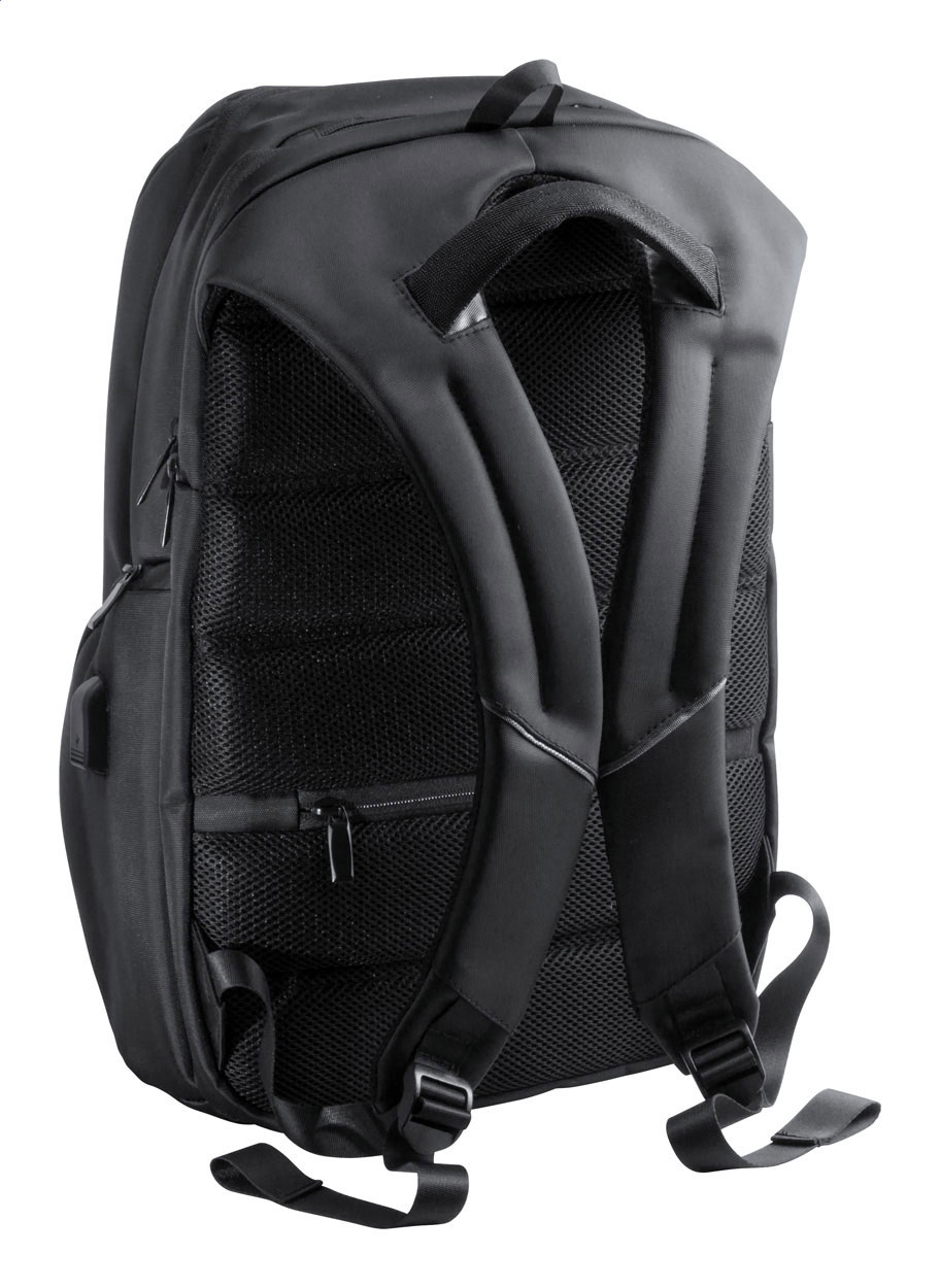 Zaino impermeabile in nylon con scomparti multipli e chiusura zip, tasca anti taccheggio, scomparto imbottito per computer (15"), schienale e spallacci. Con connettore USB integrato per power bank.