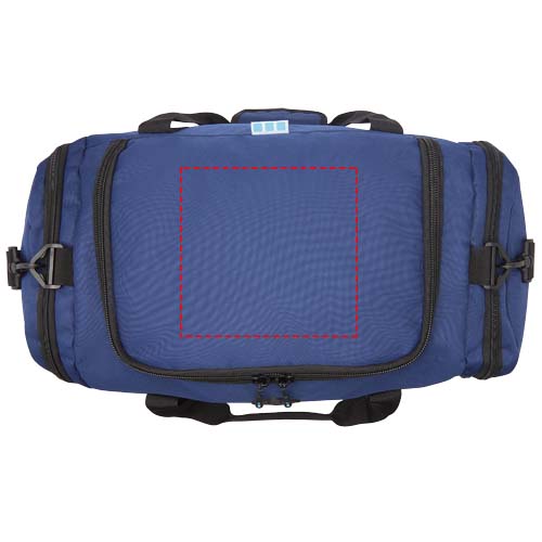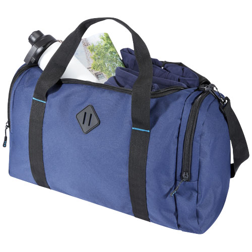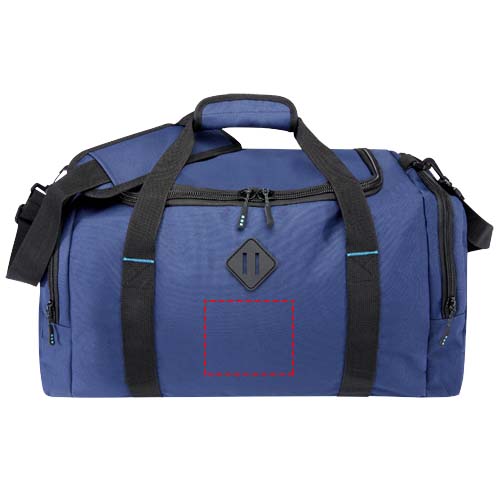 Borsone REPREVE® Our Ocean™ realizzato con plastica riciclata recuperata dagli oceani. Presenta un ampio scomparto principale con cerniera, due tasche laterali con zip per riporre gli oggetti come le scarpe o gli accessori, maniglie per il trasporto e una tracolla rimovibile, imbottita e regolabile.