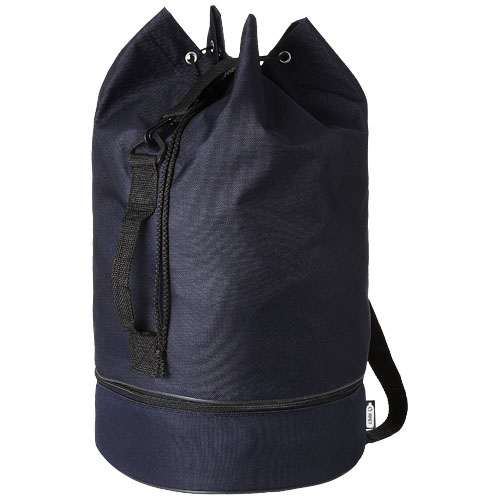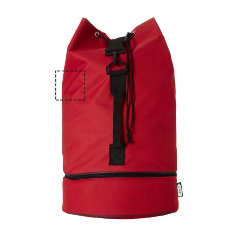 Sacca impermeabile realizzata in plastica PET riciclata con uno spazioso scomparto principale da 20 litri, chiusura a cordoncino, maniglia laterale e tracolla regolabile. Presenta inoltre uno scomparto inferiore separato con zip per contenere gli oggetti di piccole dimensioni.