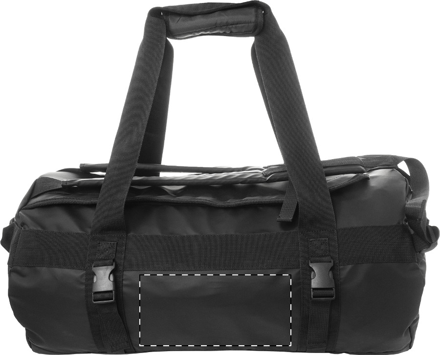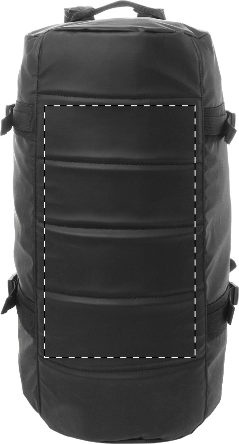 Borsa sportiva in morbida pelle PU riciclata, impermeabile e utilizzabile anche come zaino, con scomparto principale chiuso da cerniera, schienale, spallacci imbottiti edetichetta PU riciclato.