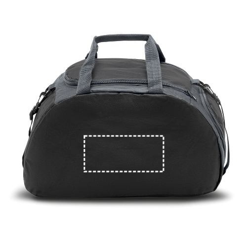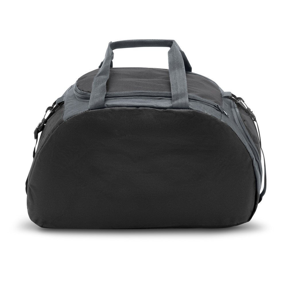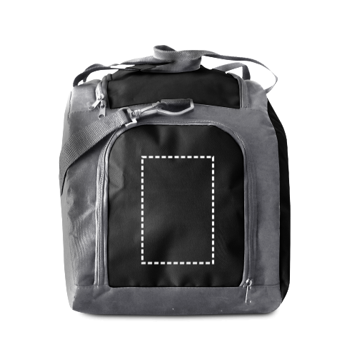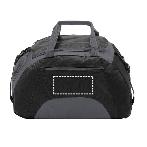 Borsone sportivo in 600D con divisorio interno, tasca anteriore e fondo con base semirigida. Tasca frontale e tasca laterale per scarpe, entrambe con zip. Tracolla regolabile