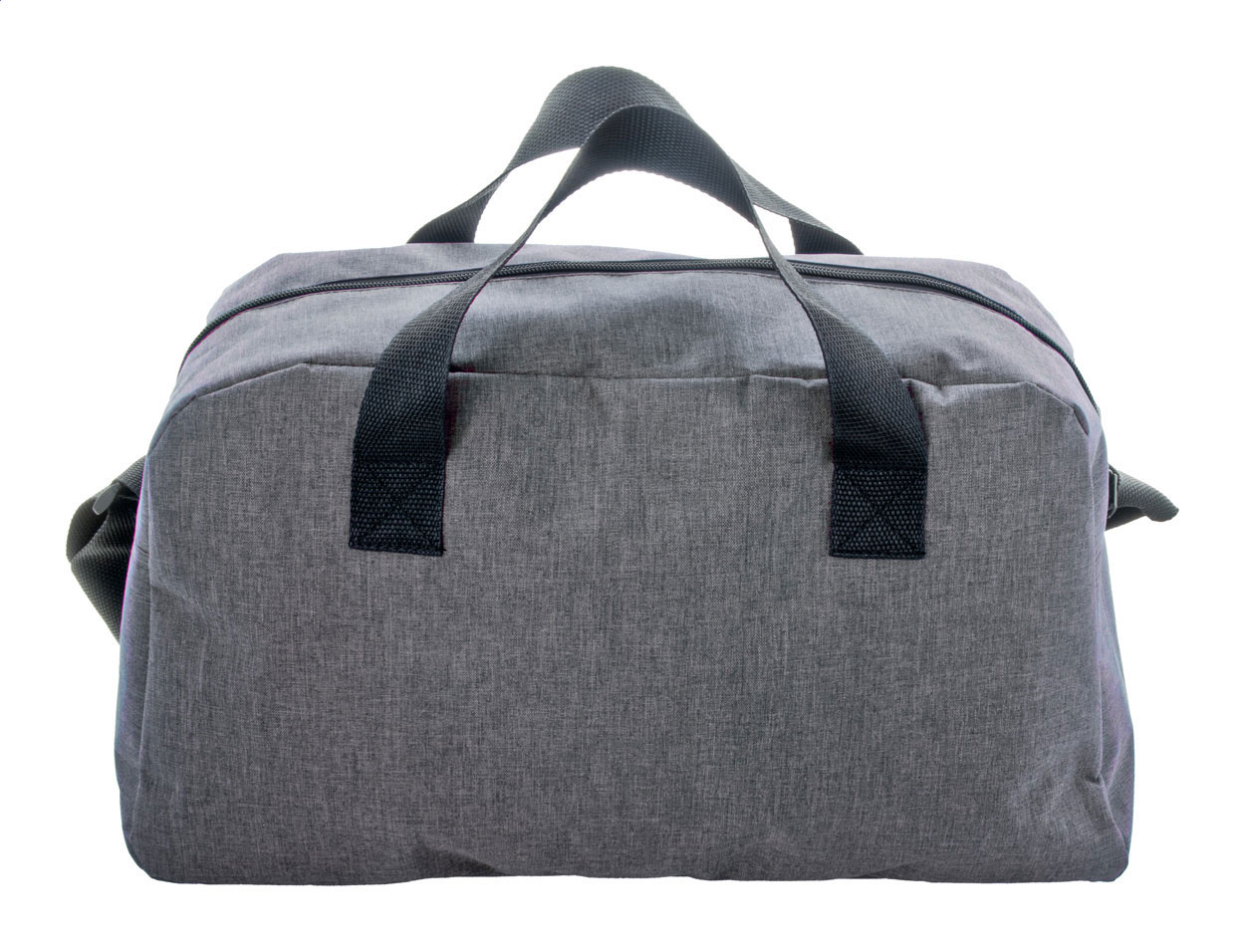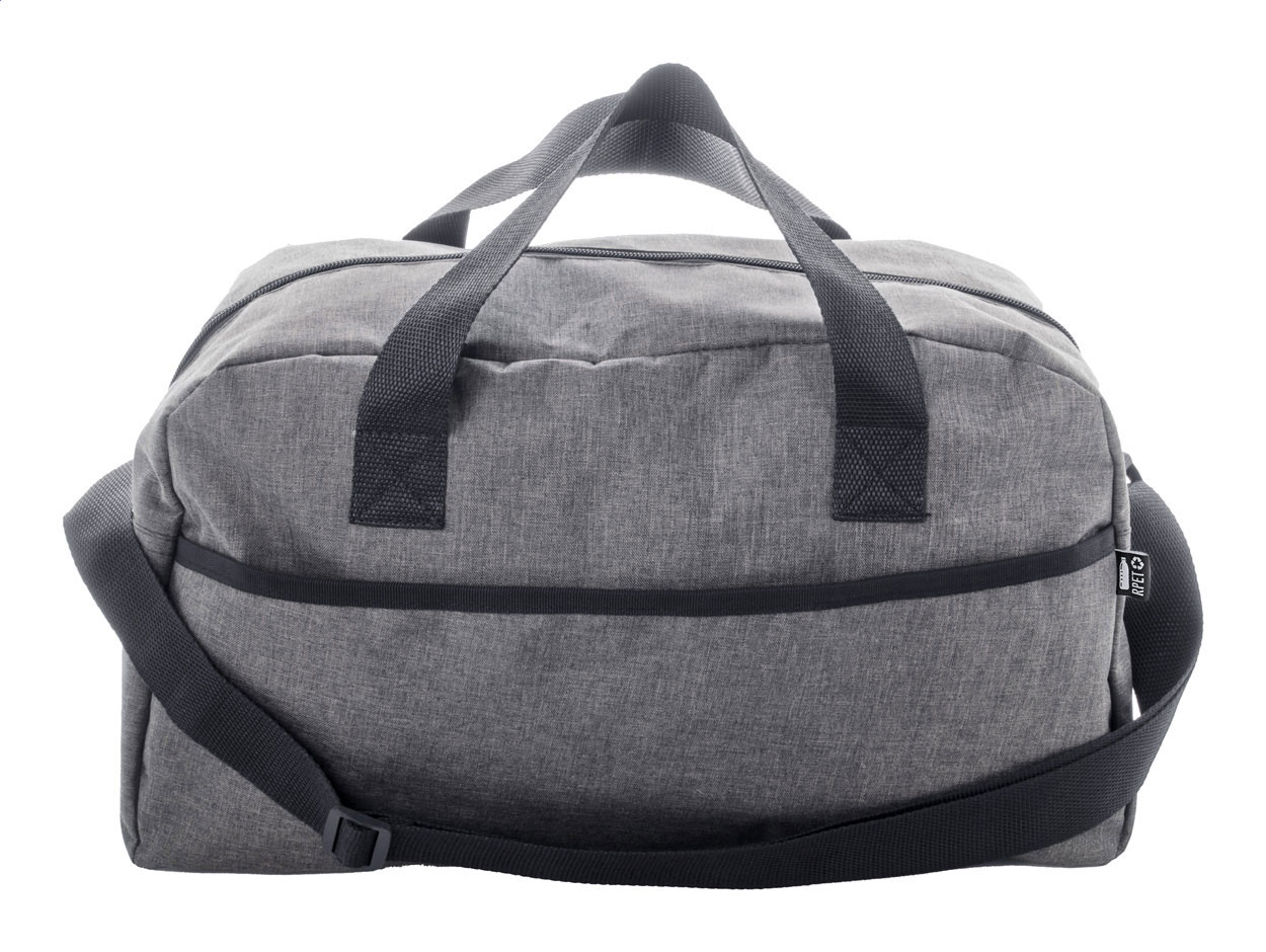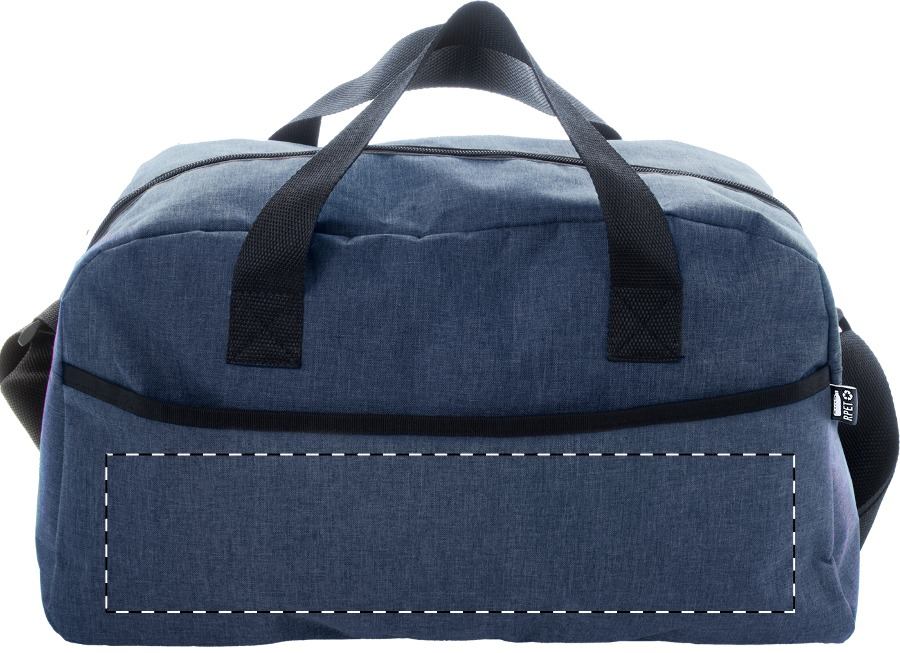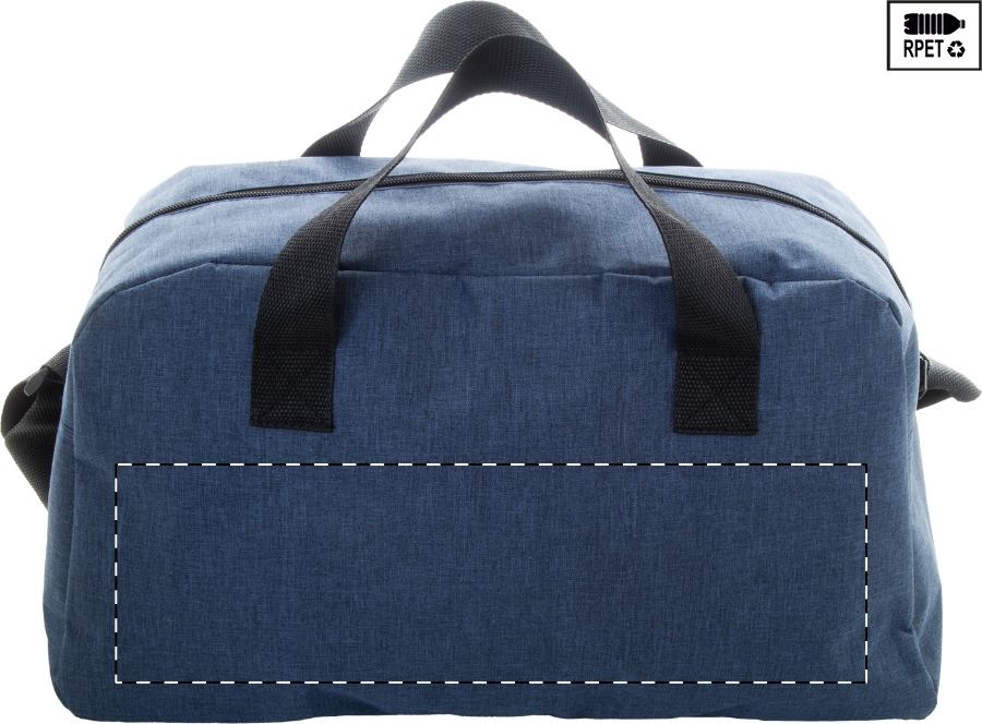Borsa sportiva in poliestere 600D RPET con scomparto principale chiuso da cerniera, tasca frontale, tracolla regolabile ed etichetta RPET.