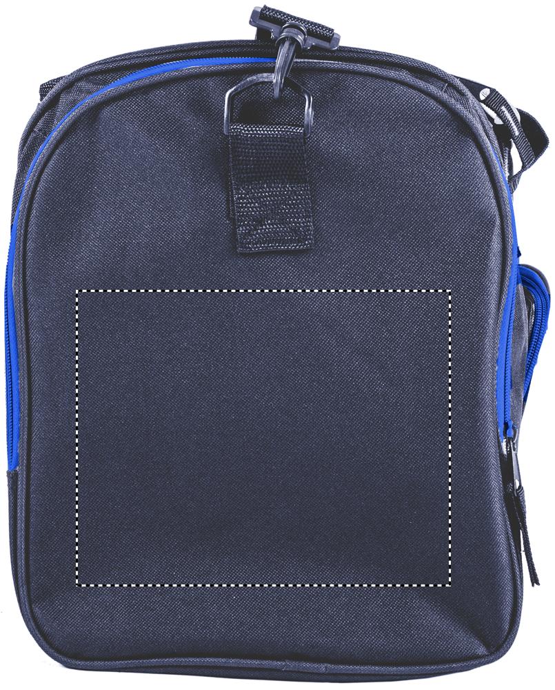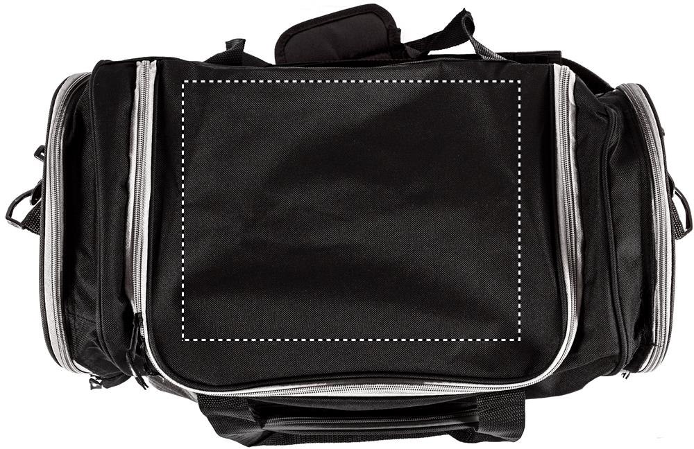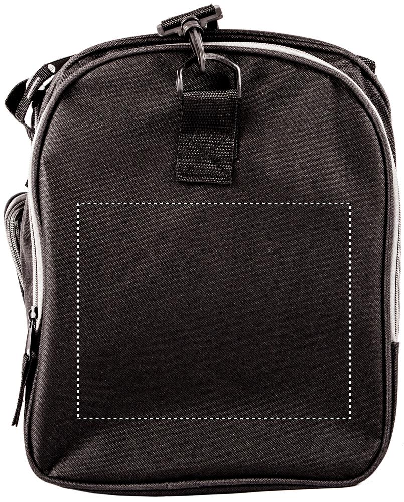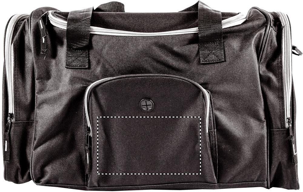 Borsone in poliestere 600D con 2 scompartimenti con chiusura zip e una tasca frontale con asola per auricolari. Tracolla regolabile e removibile inclusa.