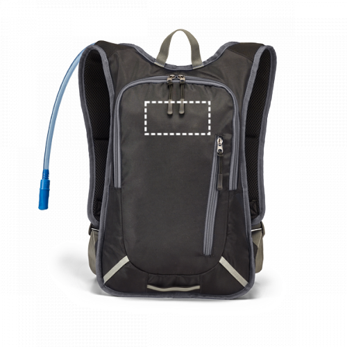 Zaino sportivo 420D con scomparto principale foderato e tasca frontale con zip. Pannello frontale con elementi rifettenti. Schienale e cinghie imbottiti per un maggiore comfort. Con una maniglia con cerniera sul retro per garantire che lo zaino si adatti facilitando il suo trasporto e uso prolungato. Lo zaino include un serbatoio dell’acqua con una capacità fino a 2 L e cannuccia. Lo zaino e il serbatoiovengono forniti separatamente