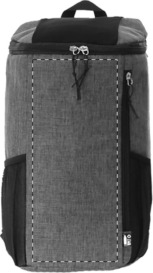 Zaino termico in poliestere 600D RPET con cerniera nella tasca principale, imbottitura in PEVA, tasche laterali in rete, spallacci imbottiti ed etichetta RPET.