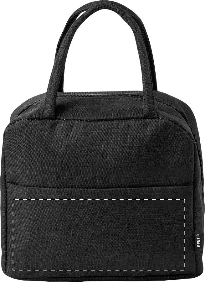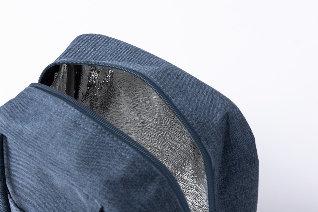 Borsa frigo in poliestere 600D RPET con tasche chiuse da cerniera, imbottitura in alluminio, manici ed etichetta RPET.