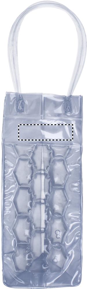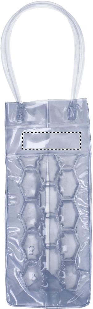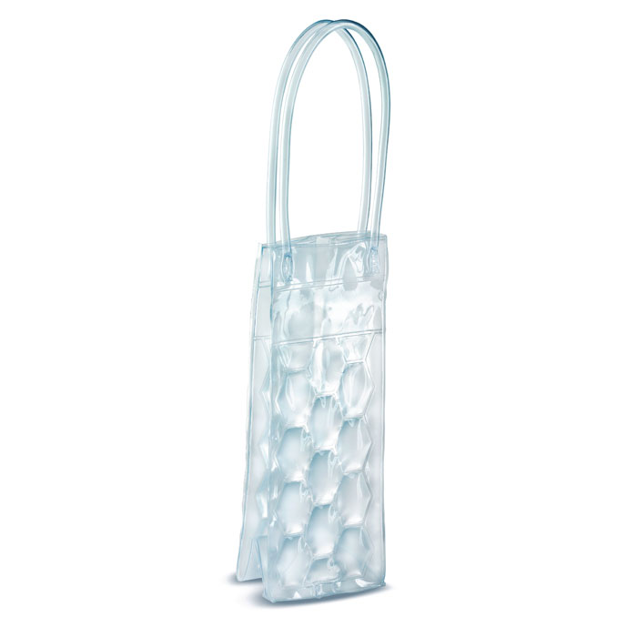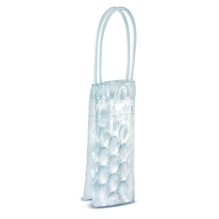 Borsa termica con manici per una bottiglia (non inclusa) in PVC trasparente con intercapedini a nido d'ape pieni di liquido refrigerante. Da tenere in freezer per raffreddare il liquido interno.