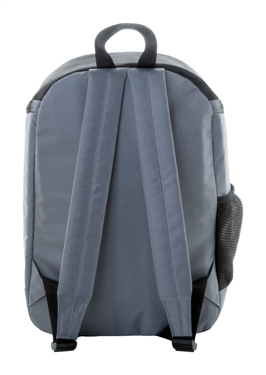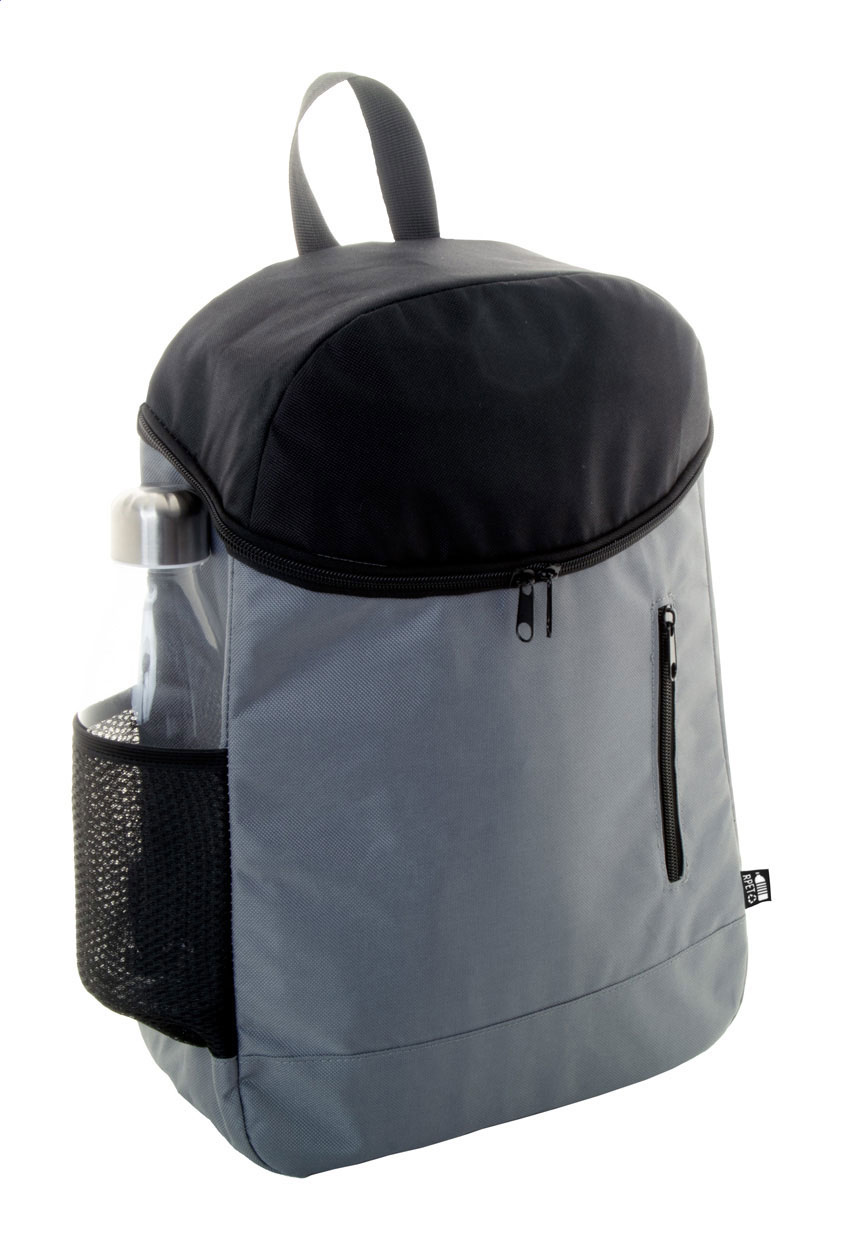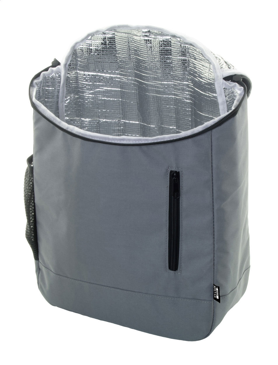 Zaino termico in poliestere 600D RPET, con imbottitura in alluminio, tasca laterale in rete, scomparto principale con cerniera, tasca frontale ed etichetta RPET.