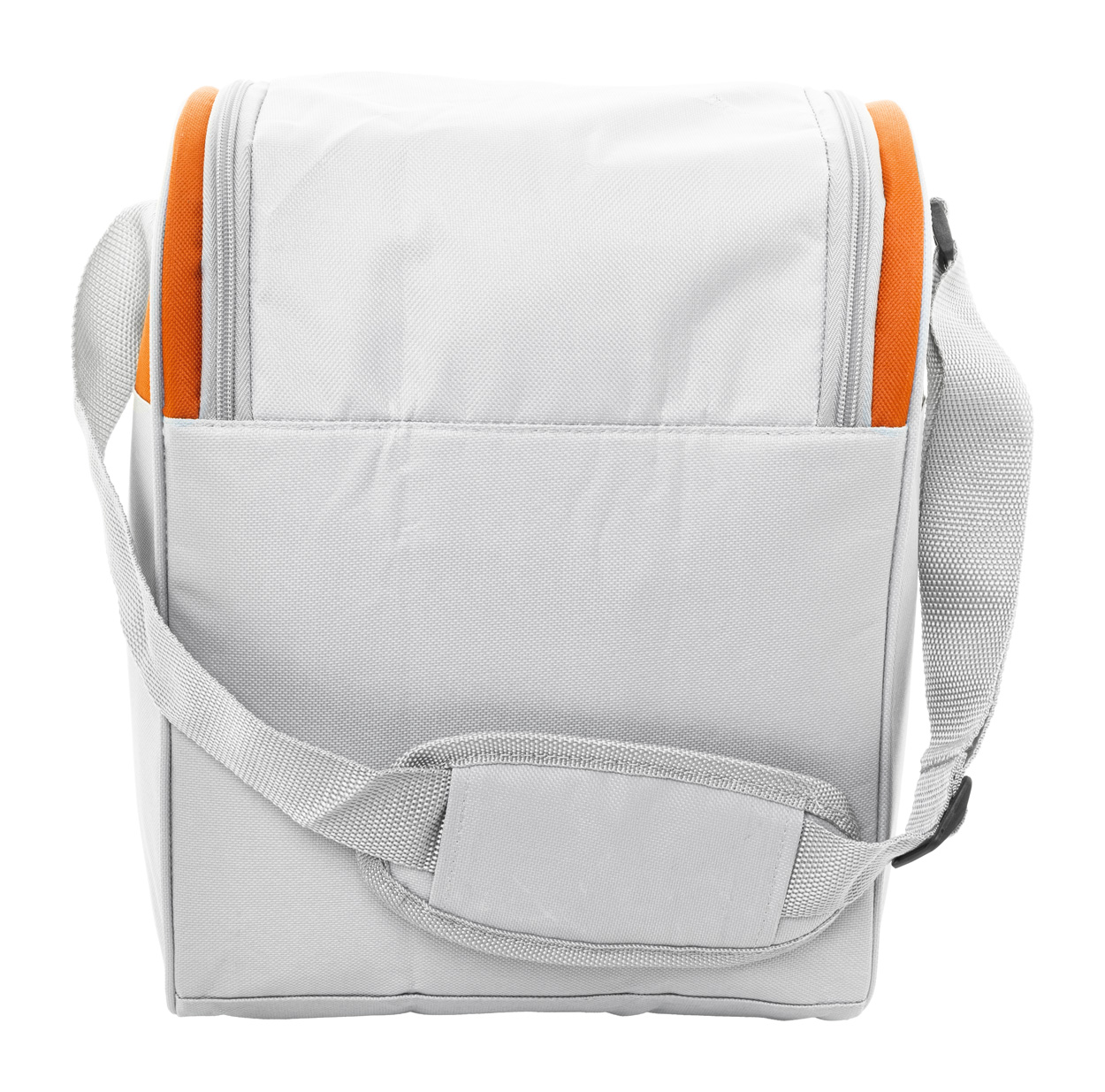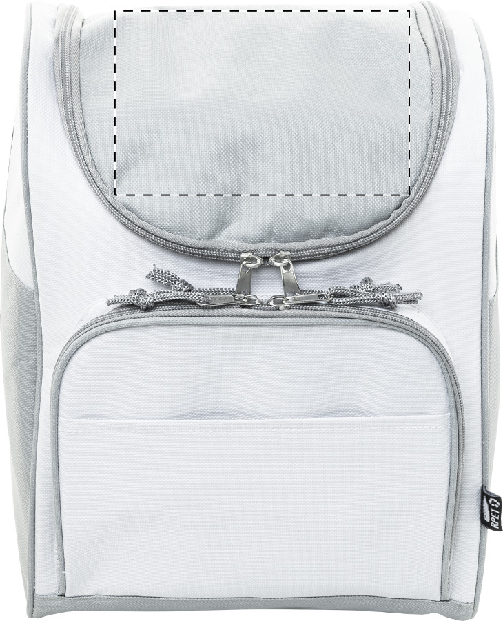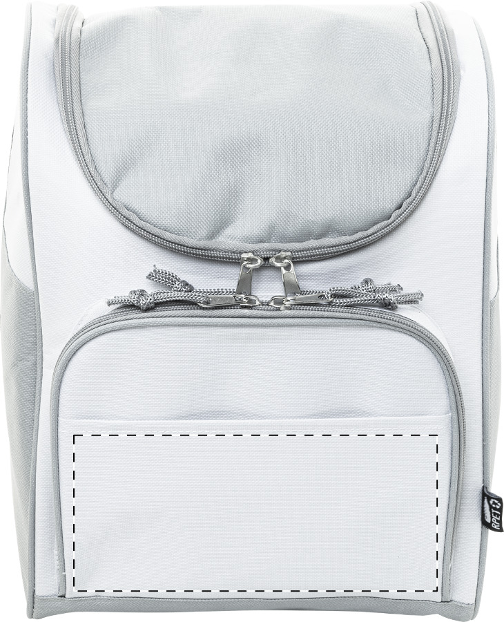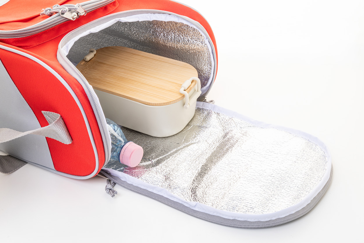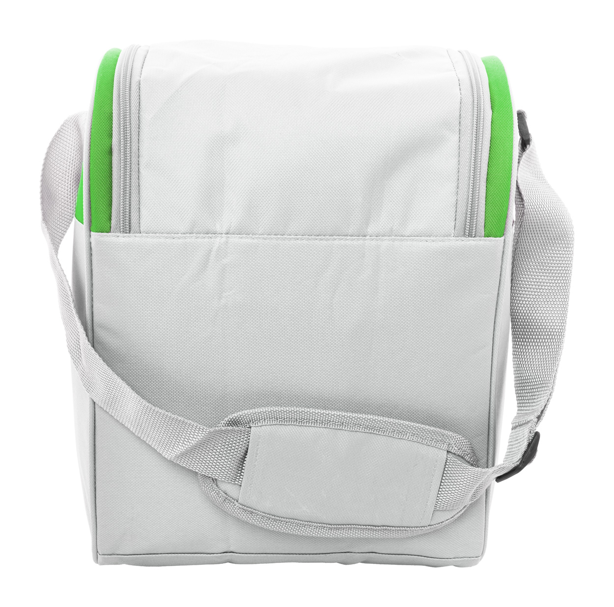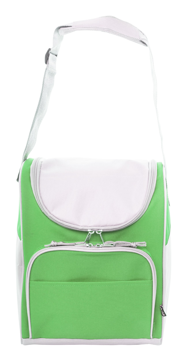 Borsa termica in poliestere 600D RPET con imbottitura in alluminio, 2 scomparti chiusi da cerniera, piccola tasca frontale, tracolla regolabile ed etichetta RPET.
