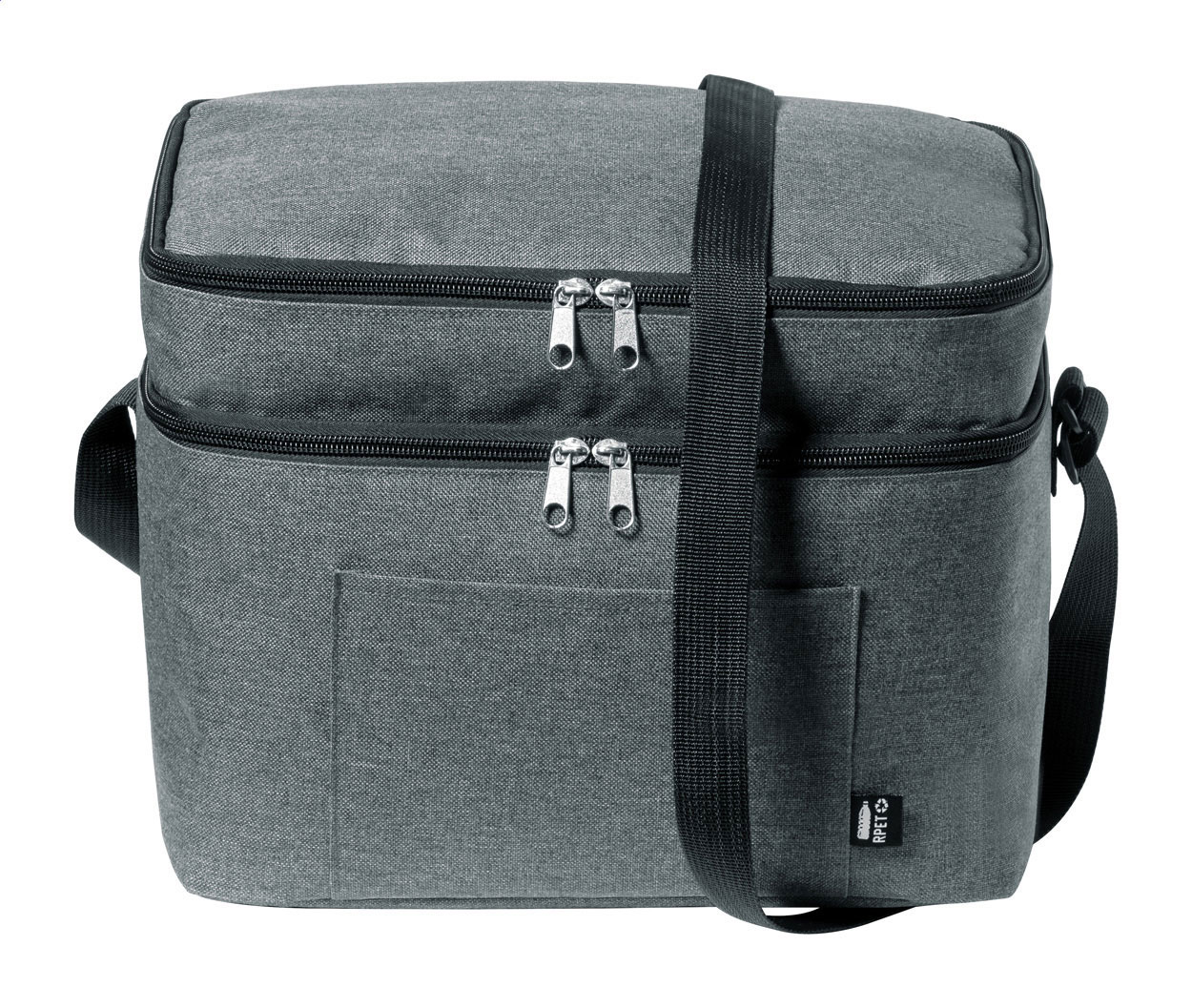 Borsa termica in poliestere 600D RPET ed imbottitura in PEVA, 2 scomparti con cerniera e tracolla regolabile. Con etichetta RPET.
