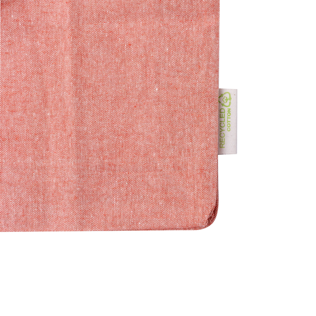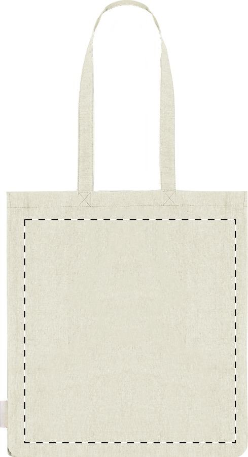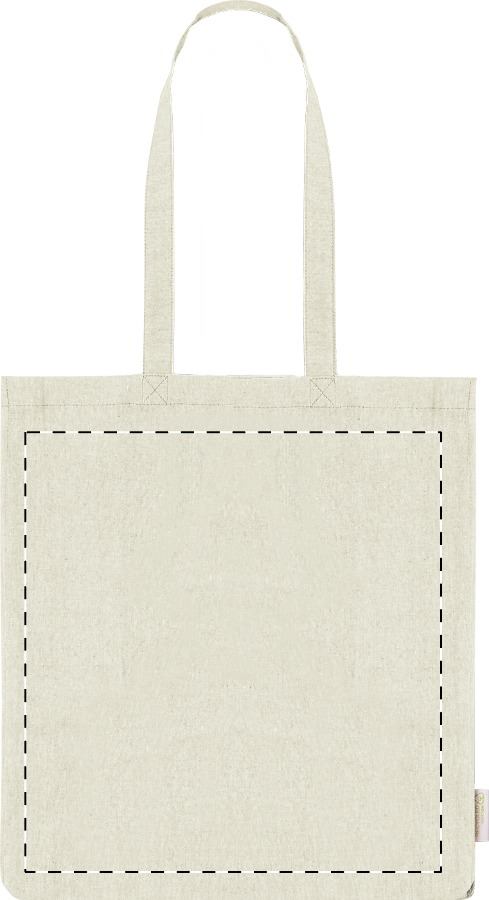 Shopper in 100% cotone riciclato, 140 g/m². con soffietto, manici lunghi ed etichetta cotone riciclato.