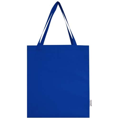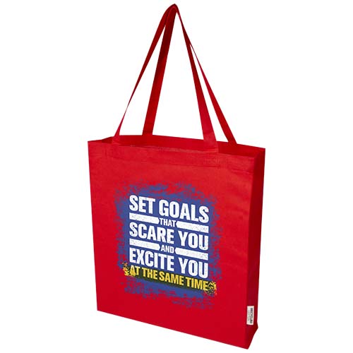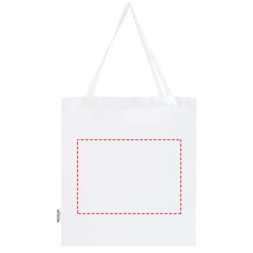 La tote bag a soffietto Madras realizzata in cotone riciclato al 100% certificato GRS è perfetta da regalare durante un evento, una conferenza, oppure da utilizzare come shopper per la spesa. La densità del cotone di 140 g/m² rende questa borsa robusta, resistente e adatta per trasportare oggetti pesanti nello scomparto principale. Grazie ai manici a spalla lunghi 30 cm, questa tote bag è facile da trasportare. Anche i metodi di stampa disponibili per questa tote bag sono certificati GRS, assicurando che l'intera catena di fornitura sia trasparente e certificata. Realizzata in India. Resistenza fino a 5 kg di peso.